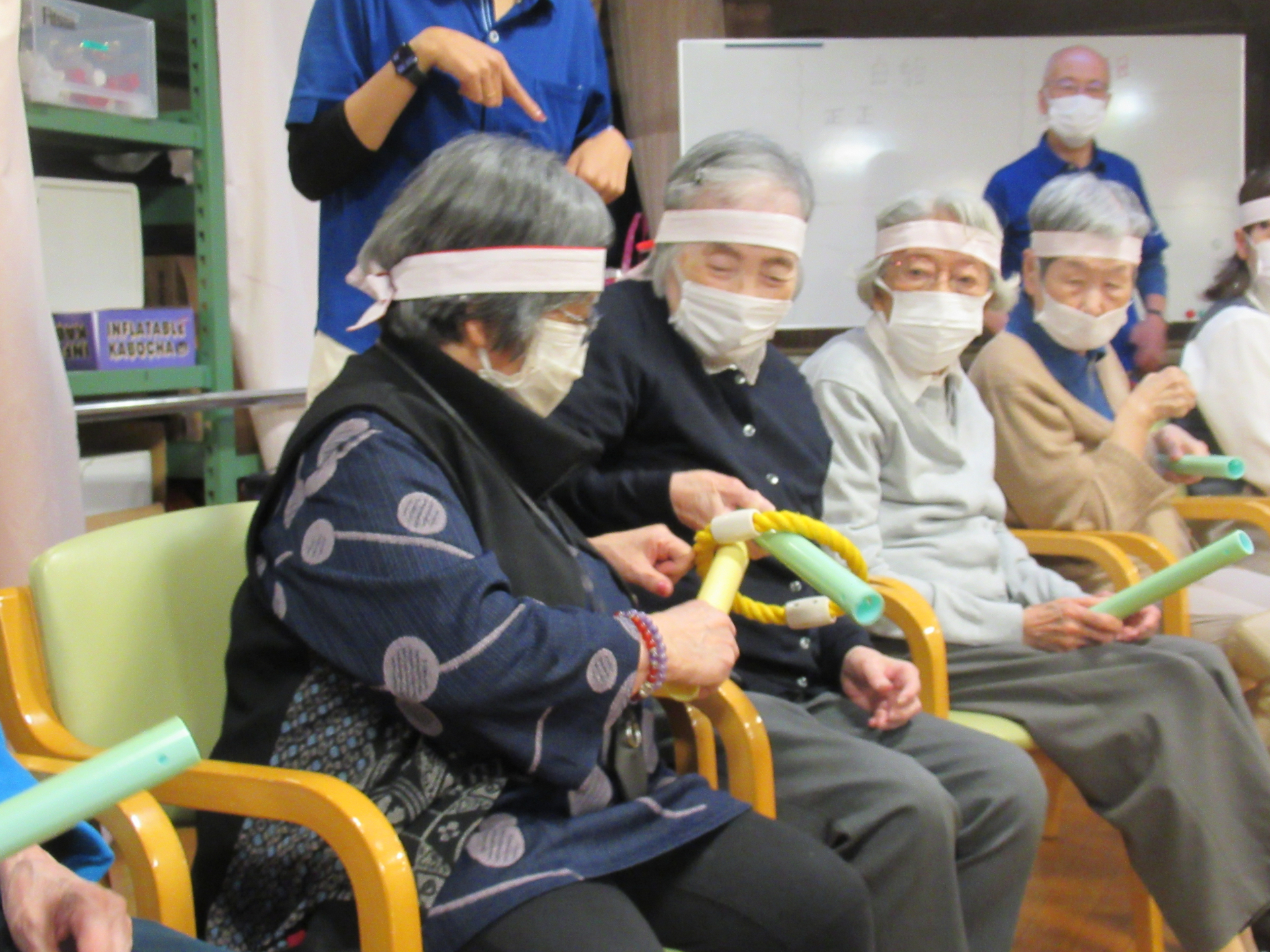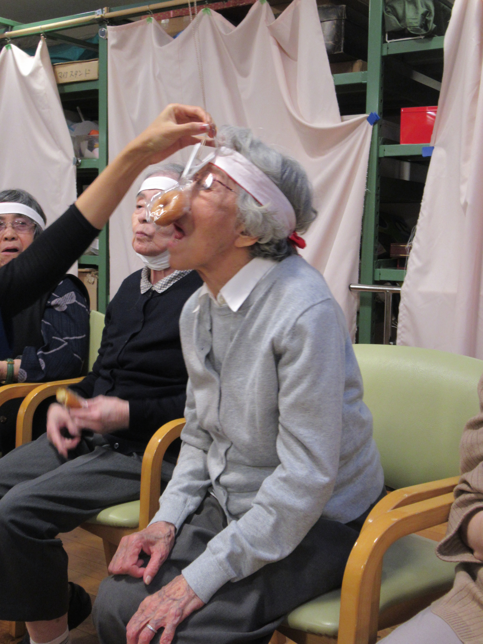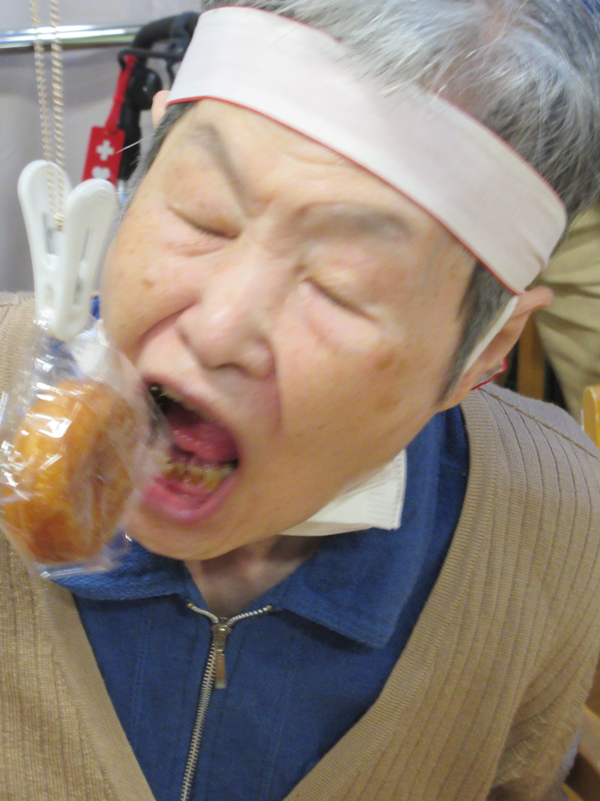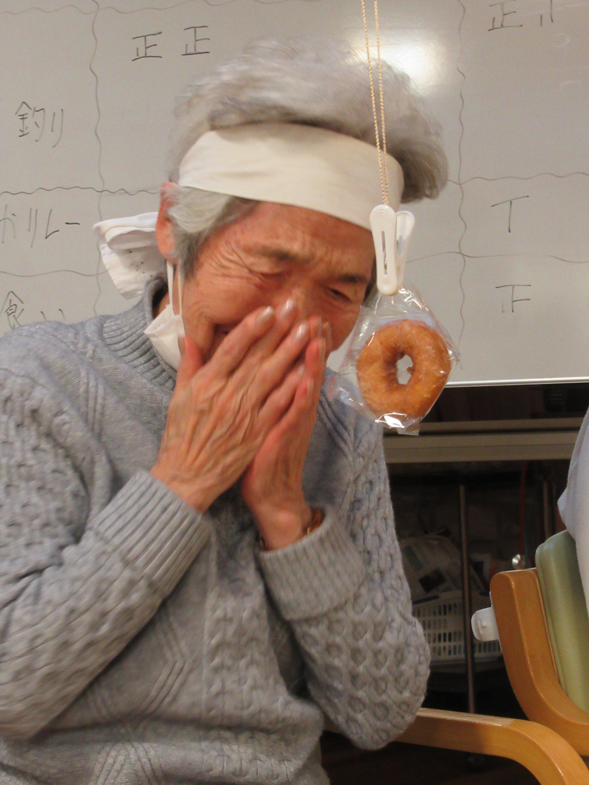 「パン食い競争」は、小分けにされたミニドーナツを口を使って洗濯ばさみから外す競技です。この種目は、動くドーナツに悪戦苦闘される方が続出(笑)大きな口を開けてドーナツを追い回す様子に、周りのご利用者も大盛り上がりで「笑いすぎて涙が出ちゃった(笑)」と話されている方もいらっしゃいました☆