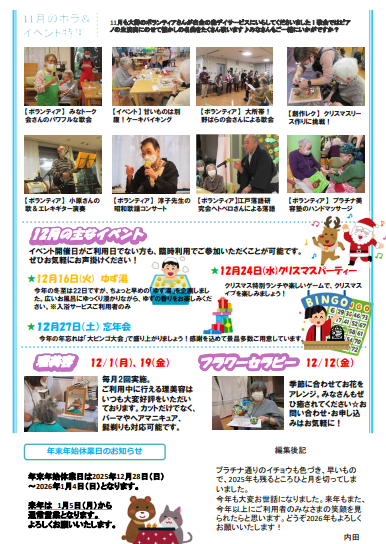 2025.12.01 お知らせ 12月の広報誌 Tweet シェアする 12月の広報誌をアップしました! #港区 #白金の森デイサービス #イベント #お知らせ 前の記事 2025.12.01 お知らせ 【ヘアカット】明るいお部屋で、優雅な時間☆ 次の記事 2025.12.01 お知らせ 【年末年始休業日】12月28日~1月4日となります。 一覧へ戻る