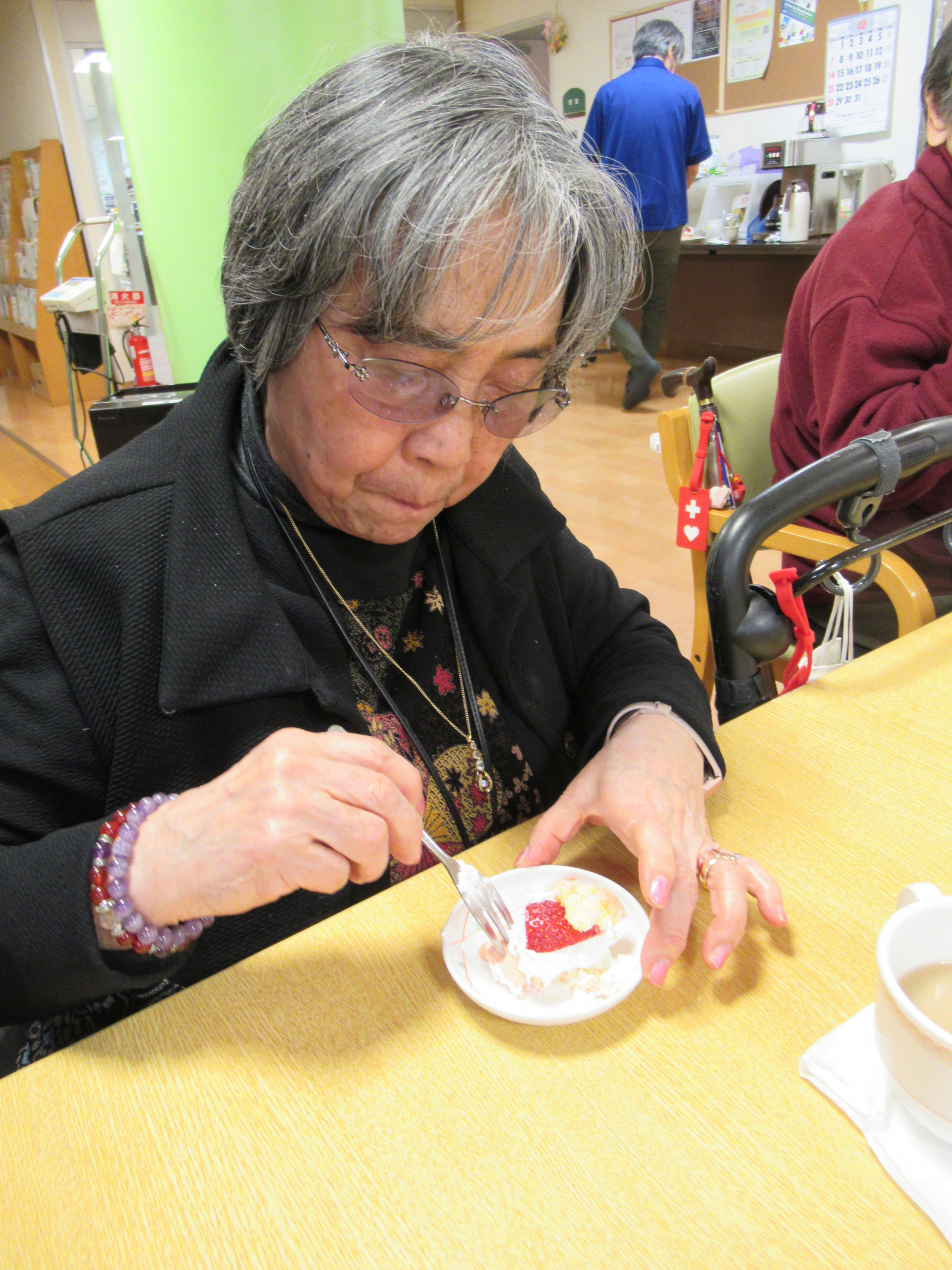 クリスマスイベント最後のお楽しみ三時のおやつは、コーヒー・紅茶に特製スイーツ。いちごのロールケーキに、生クリームとフレッシュないちごをのせました☆
