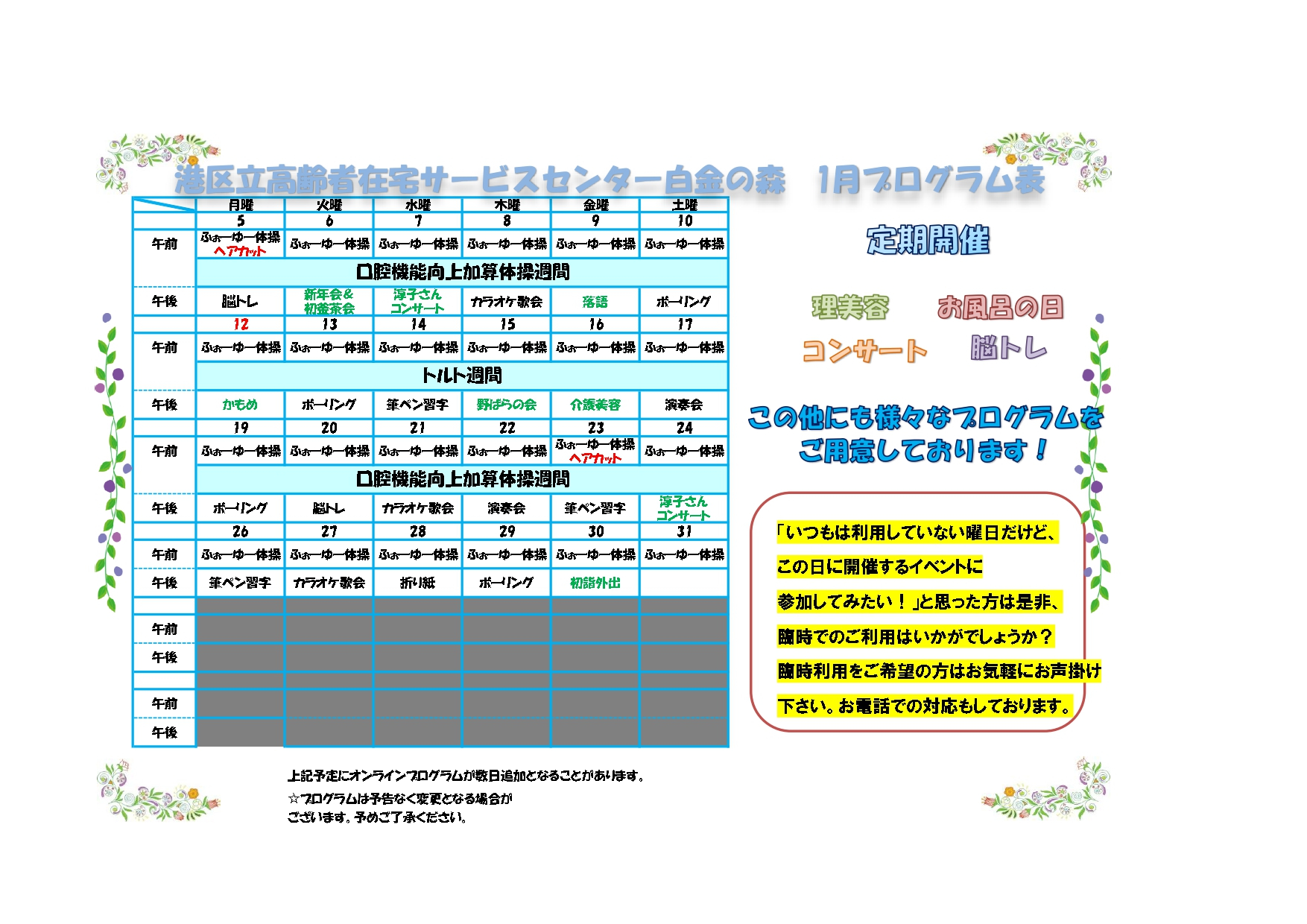2026.01.05 お知らせ 1月のイベントお知らせ Tweet シェアする 1月のプログラム表をアップしました。 前の記事 2026.01.05 お知らせ 1月の献立表 次の記事 2026.01.05 お知らせ 1月の広報誌 一覧へ戻る