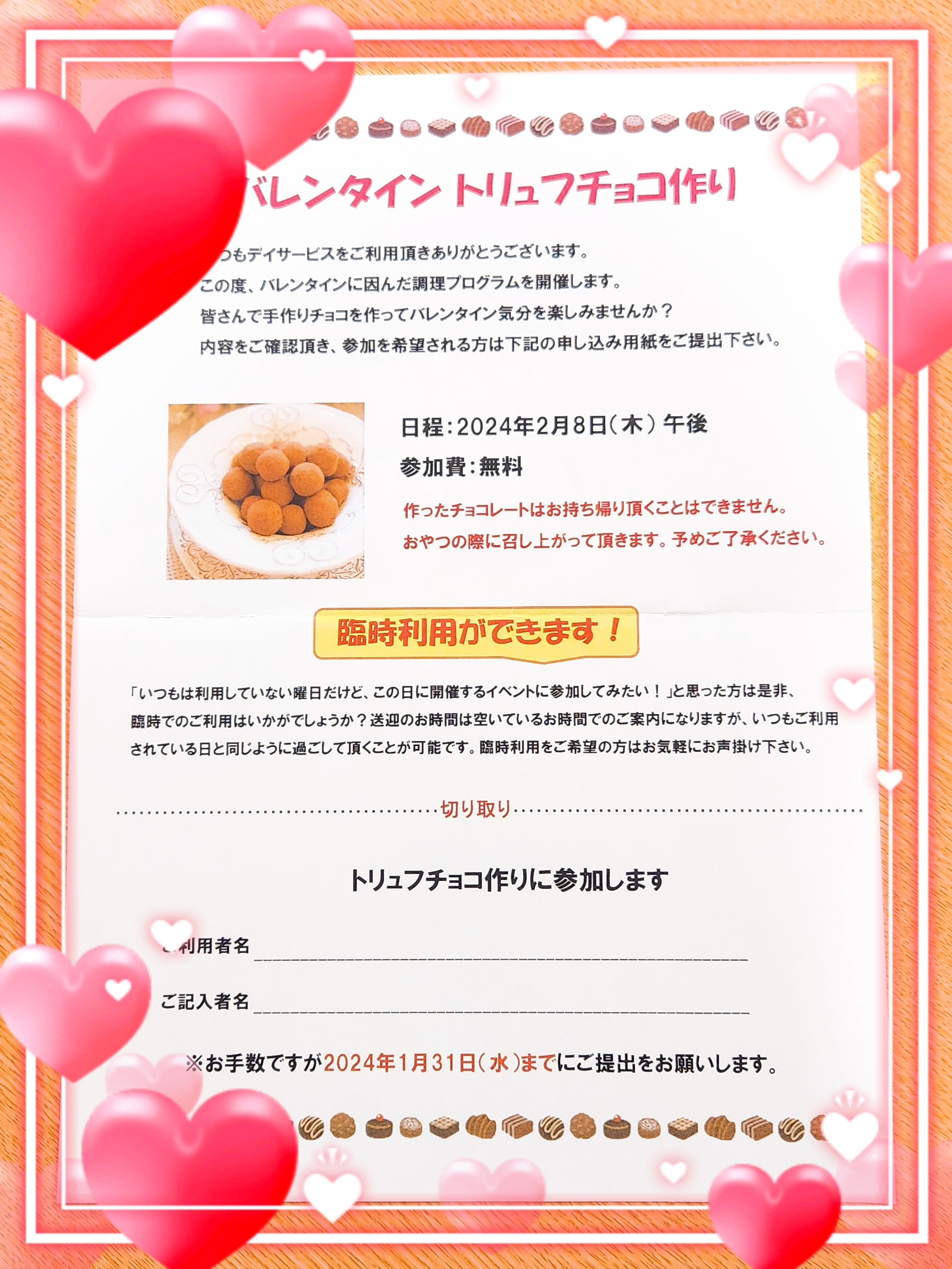 2024.01.23 活動報告 バレンタインに向けて Tweet シェアする 現在お知らせを配布しております! 来月はバレンタインがある月!一週早いですが2月8日にトリュフ作りを企画しております。 現在10名様くらいが参加希望をされています。今月末まで申し込みの受付をしております。 当日は美味しいチョコを皆さんで作って楽しみましょう♪ #デイサービス #介護 #福祉 #レクリエーション #イベント #港区 前の記事 2024.01.24 活動報告 トルトの「歩行分析結果」をお配りしています。 次の記事 2024.01.19 活動報告 懐かしい子供時代を思い出す… 一覧へ戻る