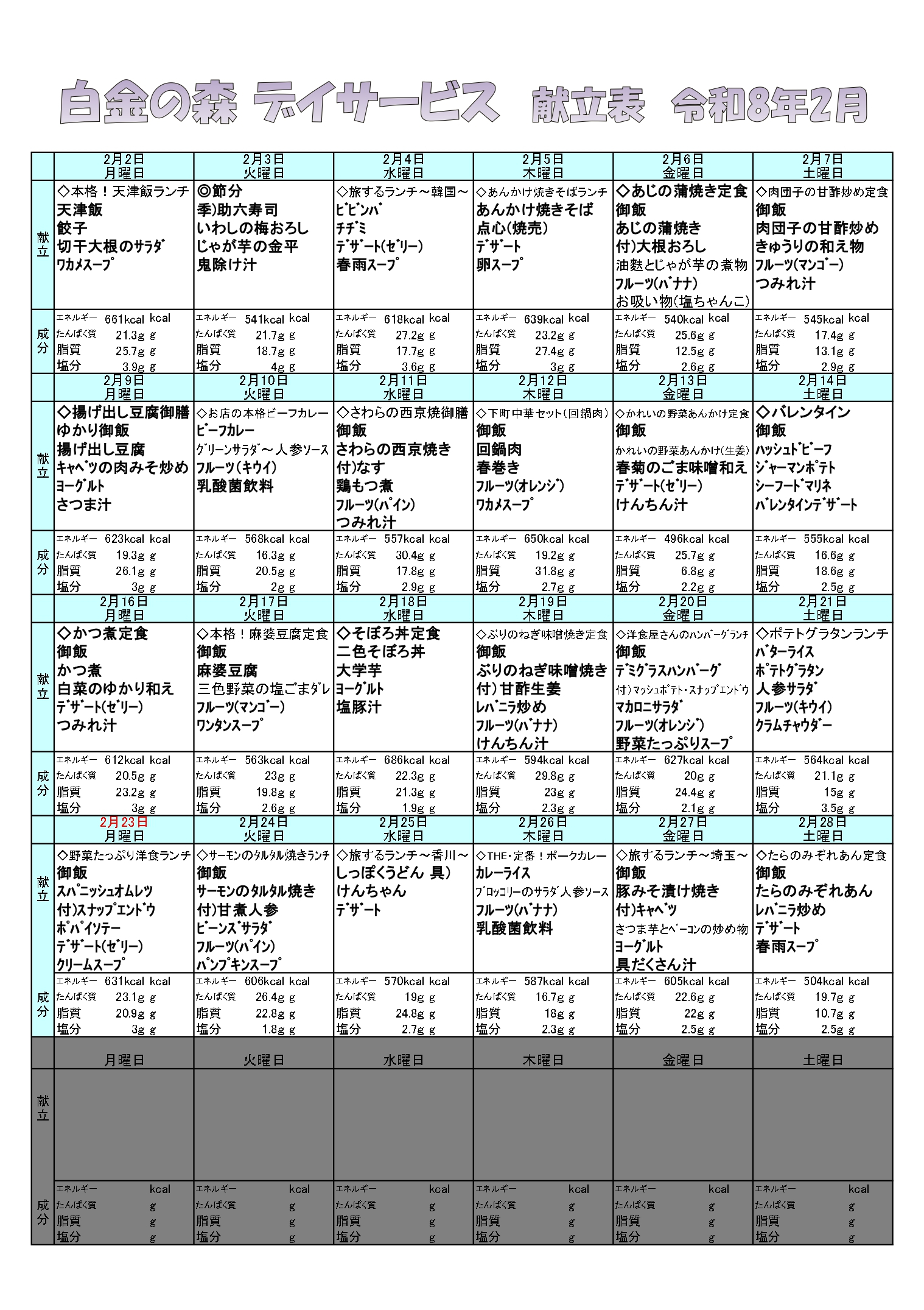 2026.02.09 NEW 活動報告 2月の献立表 Tweet シェアする 2月の献立表をアップしました。 #奉優会 #デイサービス #レクリエーション #イベント 前の記事 2026.02.12 活動報告 2月の献立表 次の記事 2026.02.05 活動報告 2月のプログラム表 一覧へ戻る