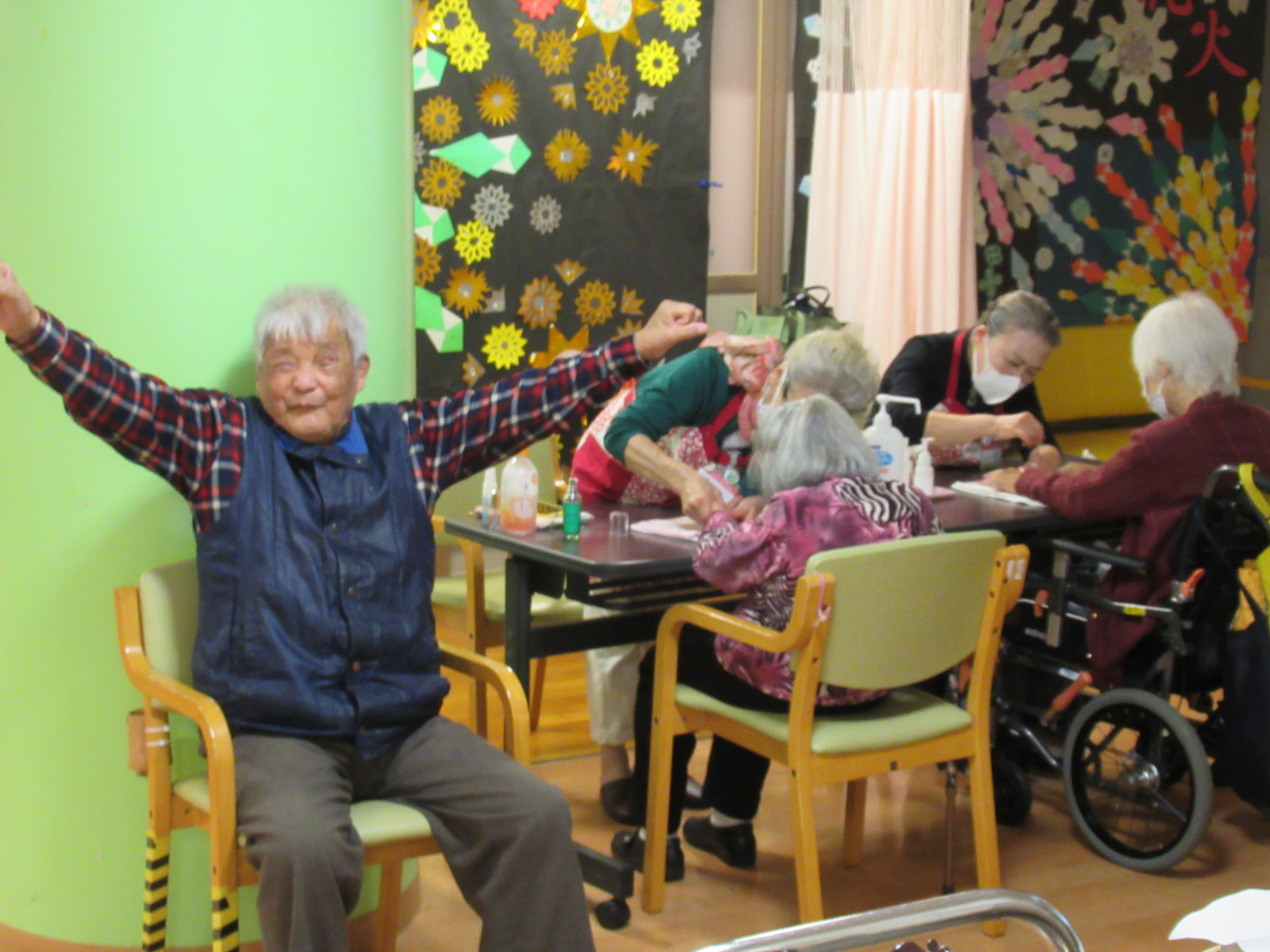 こちらの男性ご利用者は、マッサージの順番待ちをしながら午後の体操に参加☆