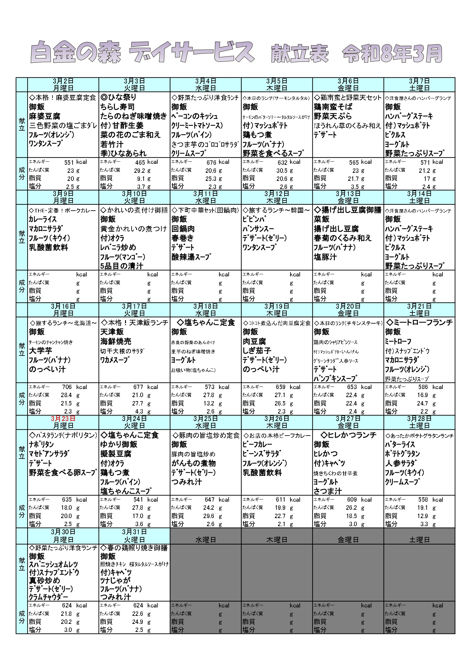 2026.03.07 お知らせ 3月の献立表 Tweet シェアする 3月の献立表をアップしました。 Y.H #奉優会 #イベント 前の記事 2026.03.10 お知らせ 【朗読ボランティア】人気コーナーでは「石川さゆりの世界」を紹介☆ 次の記事 2026.03.07 お知らせ 【ボランティア】さくらメドレー 一覧へ戻る