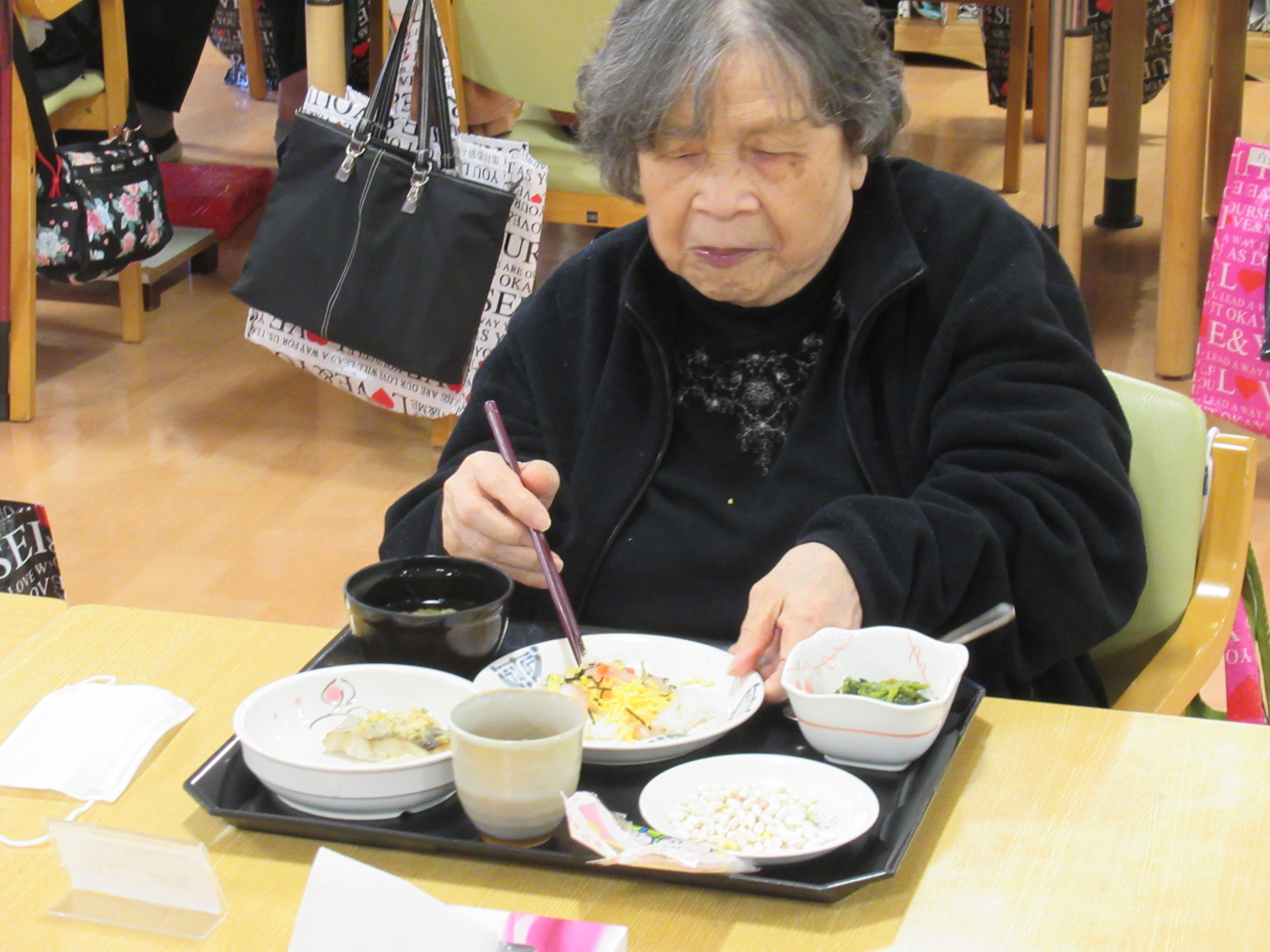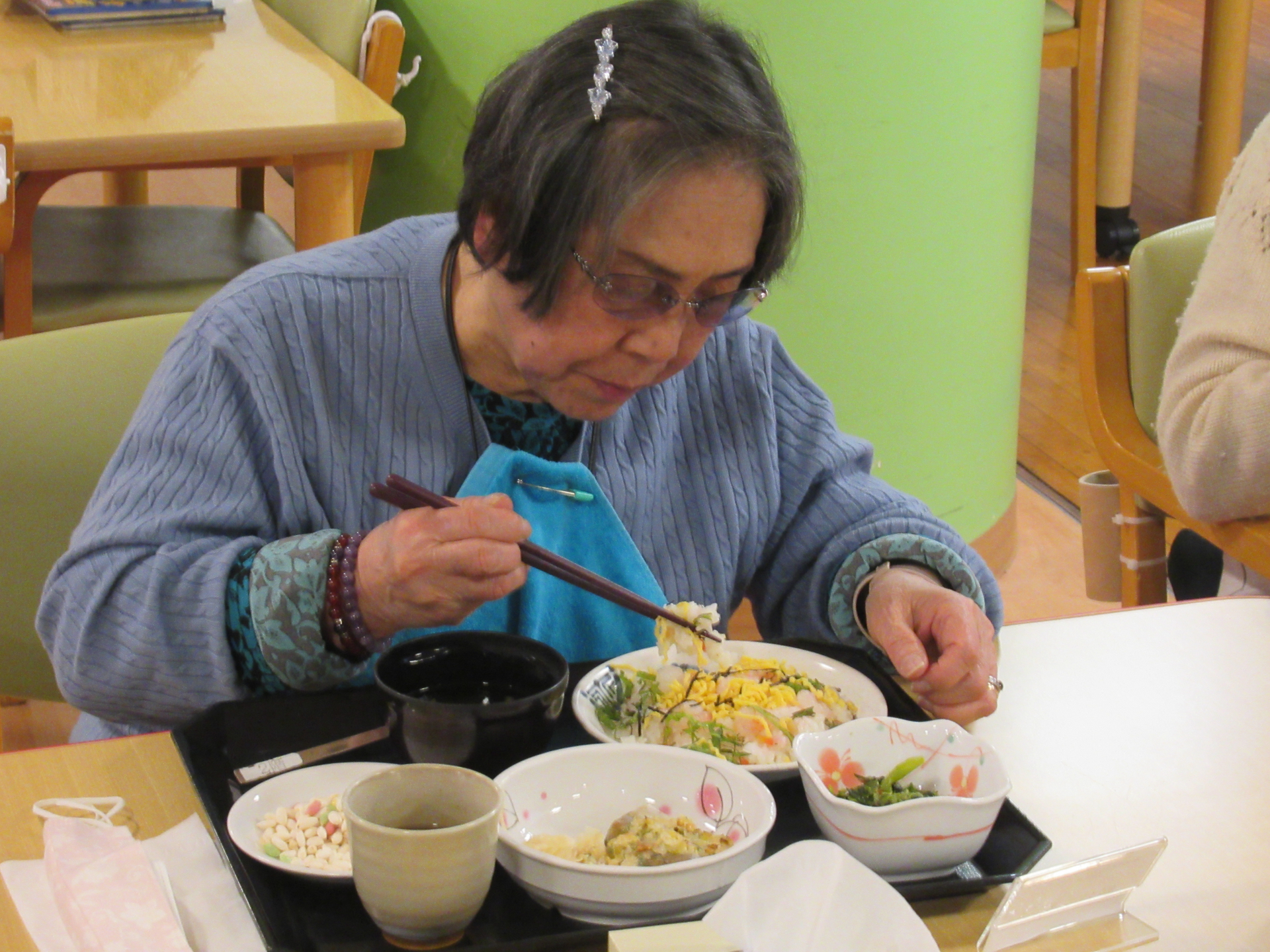 午後レク前に「今日のおちらし美味しかったよ~」と話しているご利用者もいて、春を感じるイベント食に季節を感じていただけたのではないでしょうか☆