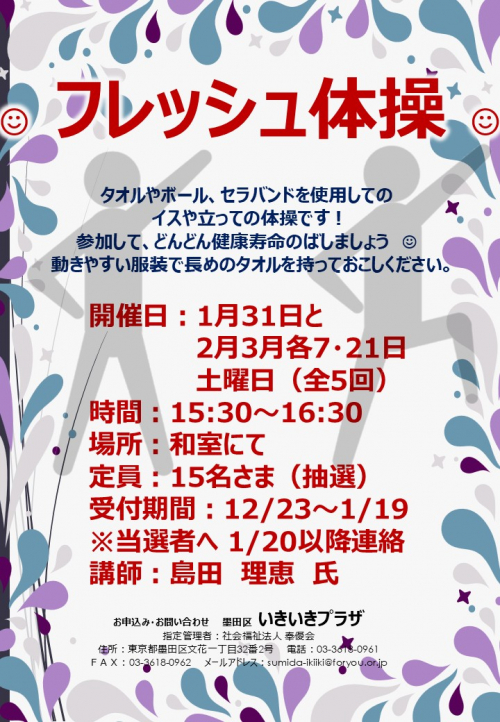 2026.02.06 NEW いきプラ体操 ㊗400回達成 •̀.̫•́✧ 活動報告 2026.02.04 能のリズムで♪チタプポ体操 活動報告 2026.02.03 スプーンとフォーク入れ★ 活動報告 2026.02.02 ♪アコースティックギターコンサート♫ 活動報告 2026.02.02 【2026年4月~9月】健康体操の募集が始まりました。 お知らせ 2026.02.02 ✧フレッシュ体操 1ー3月期始まりました✧ 活動報告 2026.01.29 『大人の小物作り教室』★2月参加者募集 お知らせ 2026.01.28 ♡ハート♥ 活動報告 2026.01.25 笑って元気脳活ゲーム教室潜入 ⸜( •ᴗ• )⸝ 活動報告 2026.01.24 くるみボタンのフェルトのブローチ★ 活動報告 2026.01.20 1月21日(水)は休館日です。 お知らせ 2026.01.20 バレンタインデー特別企画♥『チョコレートの世界へようこそ』 お知らせ 2026.01.19 やっこさんから変身★忍者 活動報告 2026.01.18 ほっこり亭落語会♪ 活動報告 2026.01.17 【参加者募集中♪】椅子に座って社交ダンス お知らせ 1 2 3 … 45