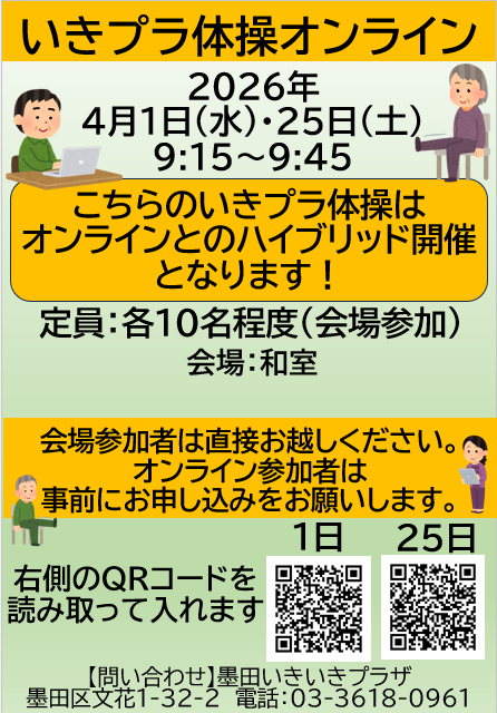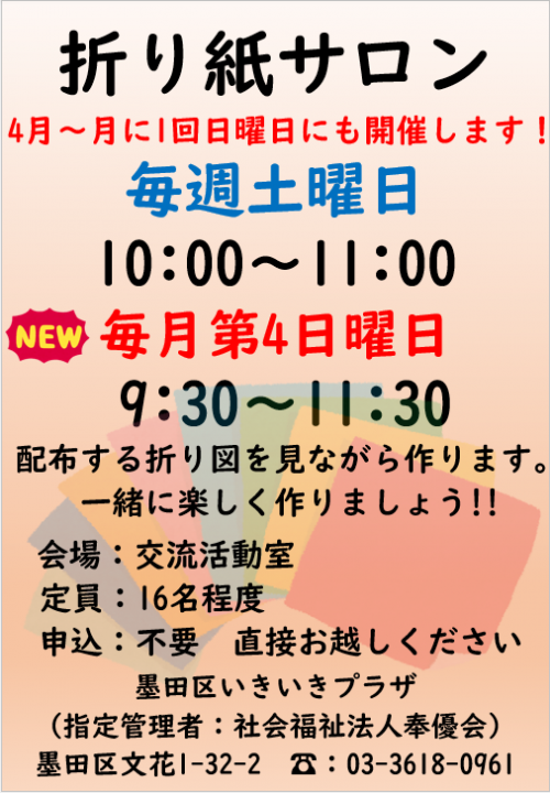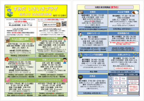 2026.03.27 NEW 4月から第4日曜日にも折り紙サロンを開催します!! お知らせ 2026.03.26 4月参加者募集★『大人の小物作り教室』 お知らせ 2026.03.25 4月★いきプラ体操オンラインのお知らせ お知らせ 2026.03.24 会食会について お知らせ 2026.03.23 祝★いきプラ体操100回 活動報告 2026.03.22 ハチがとぶ♪ 活動報告 2026.03.21 今の季節にピッタリ✿桜のカード 活動報告 2026.03.17 3月18日(水)は休館日です。 お知らせ 2026.03.16 昭和歌謡フラダンスを開催しました 🌺 活動報告 2026.03.16 全4回講座★チタプポ体操の参加者を募集中! お知らせ 2026.03.16 脳トレ散歩のご紹介★ 活動報告 2026.03.15 昭和レジェンズ新メンバーを募集中★ お知らせ 2026.03.15 4月の予定表を発行しました。 お知らせ 2026.03.15 月だより4月号を発行しました。 お知らせ 2026.03.14 カエルのコインケース☆彡 活動報告 1 2 3 … 48
