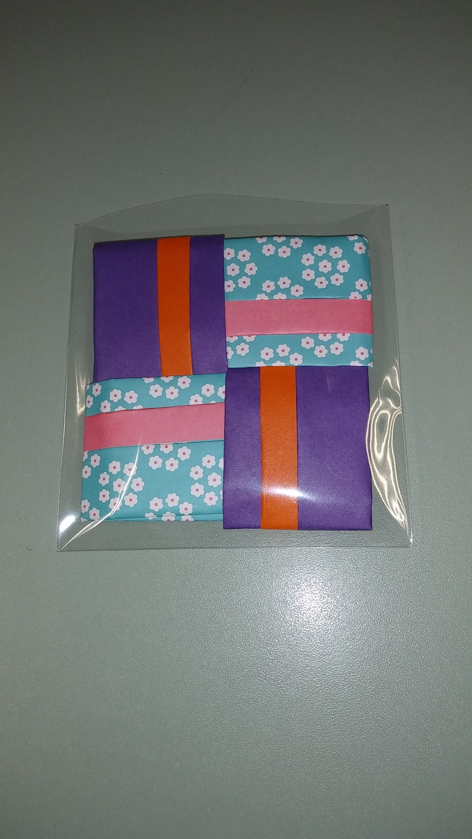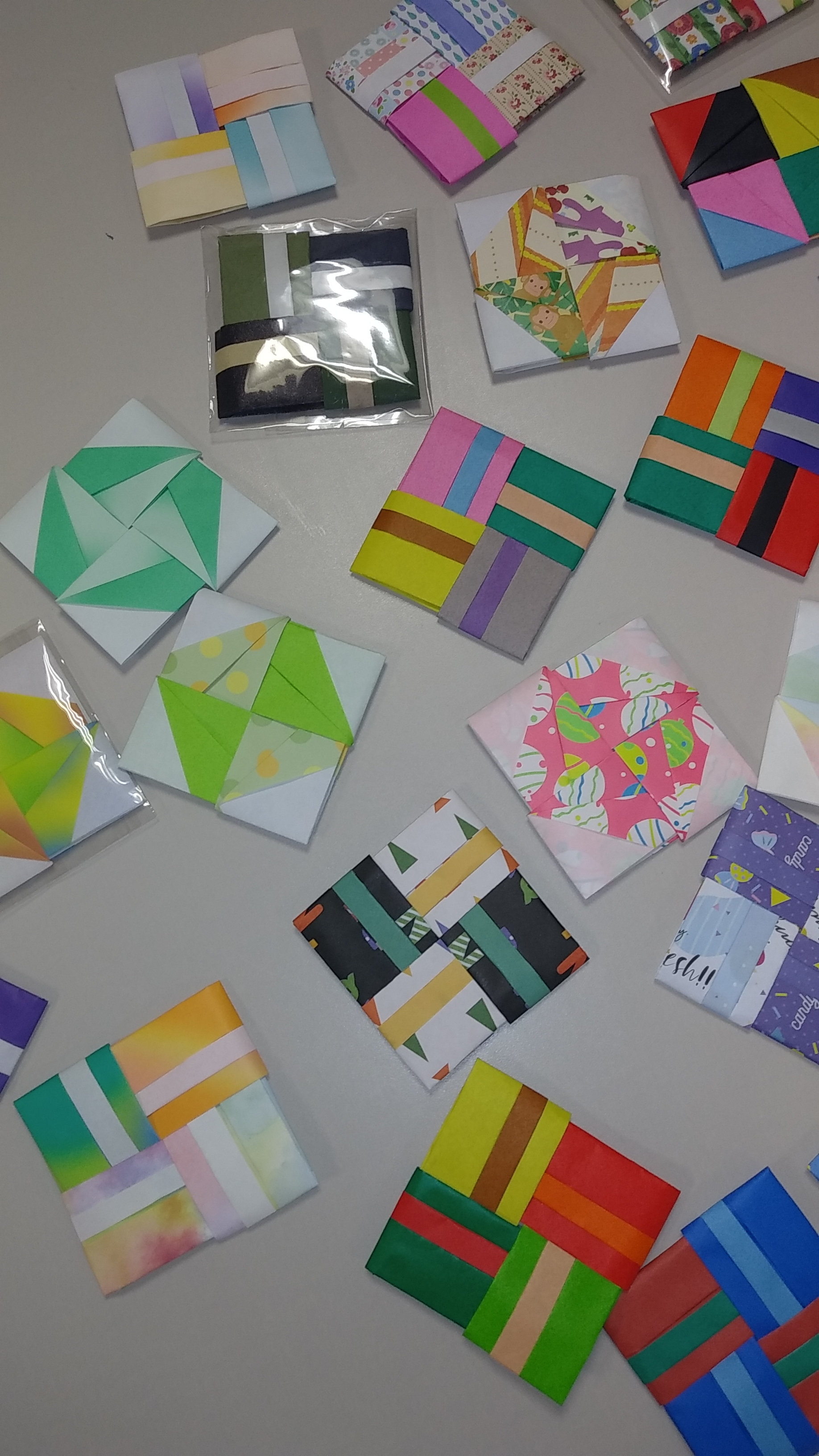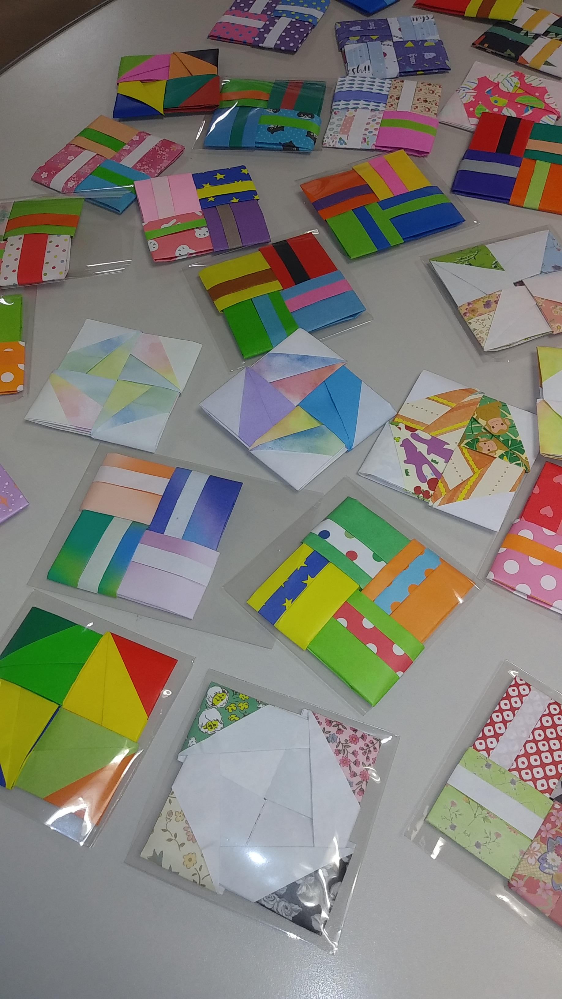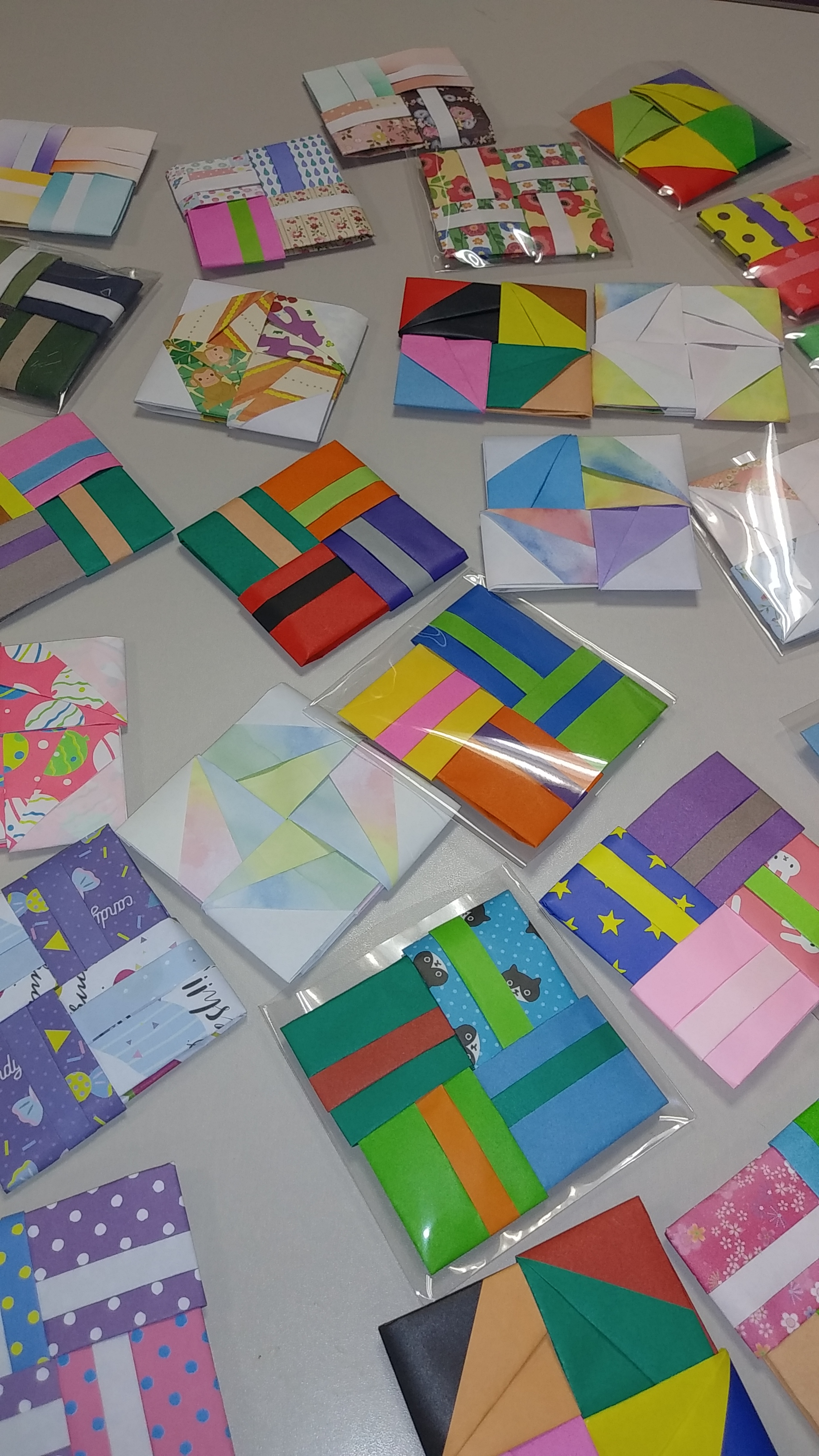 両面折り紙を使ったり、柄の折り紙を使ったりとカラフルなコースターが出来ました。組み合わせに少し悩みますが、すぐ作れるようになったようです。皆さん、沢山作って下さいました。