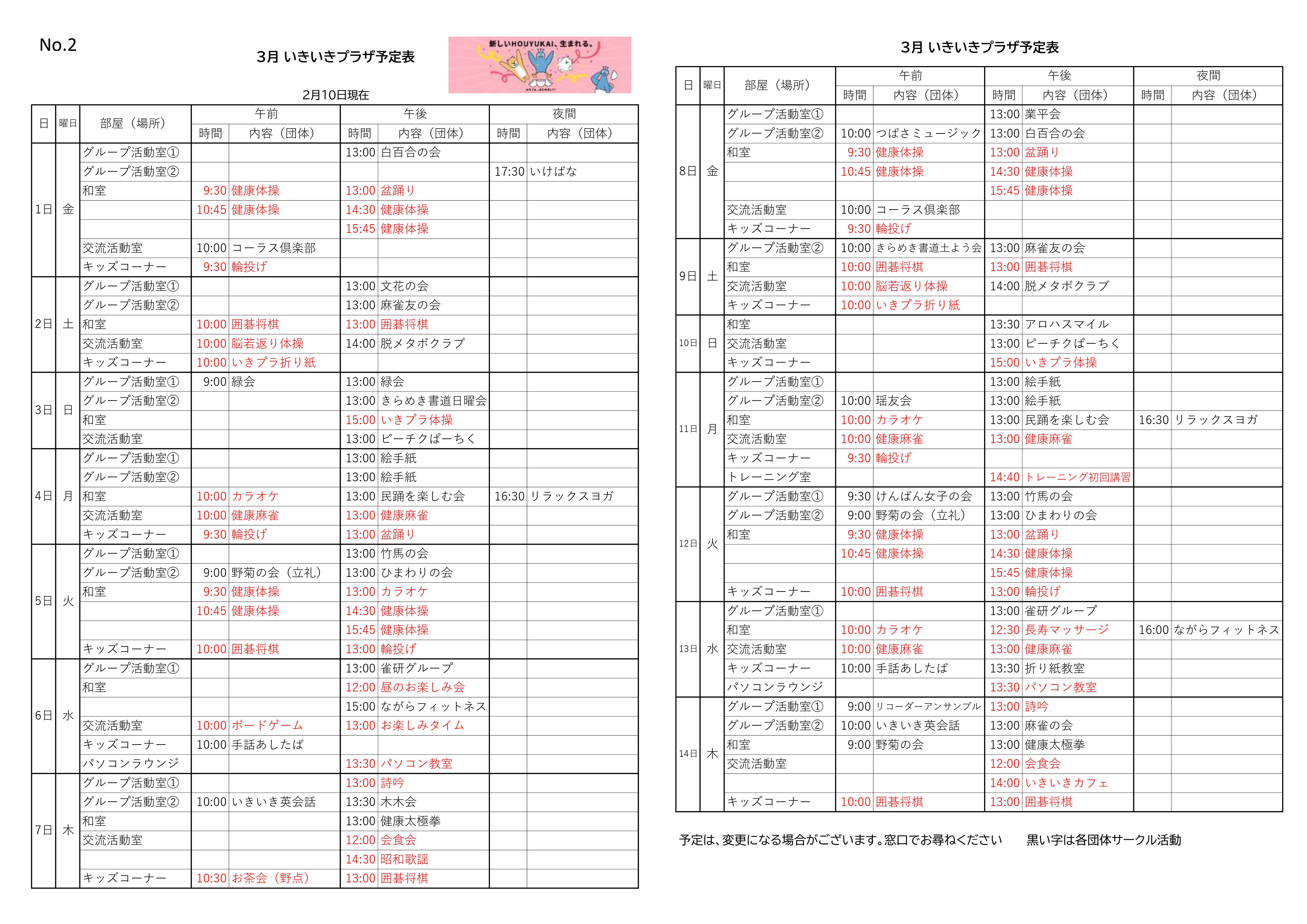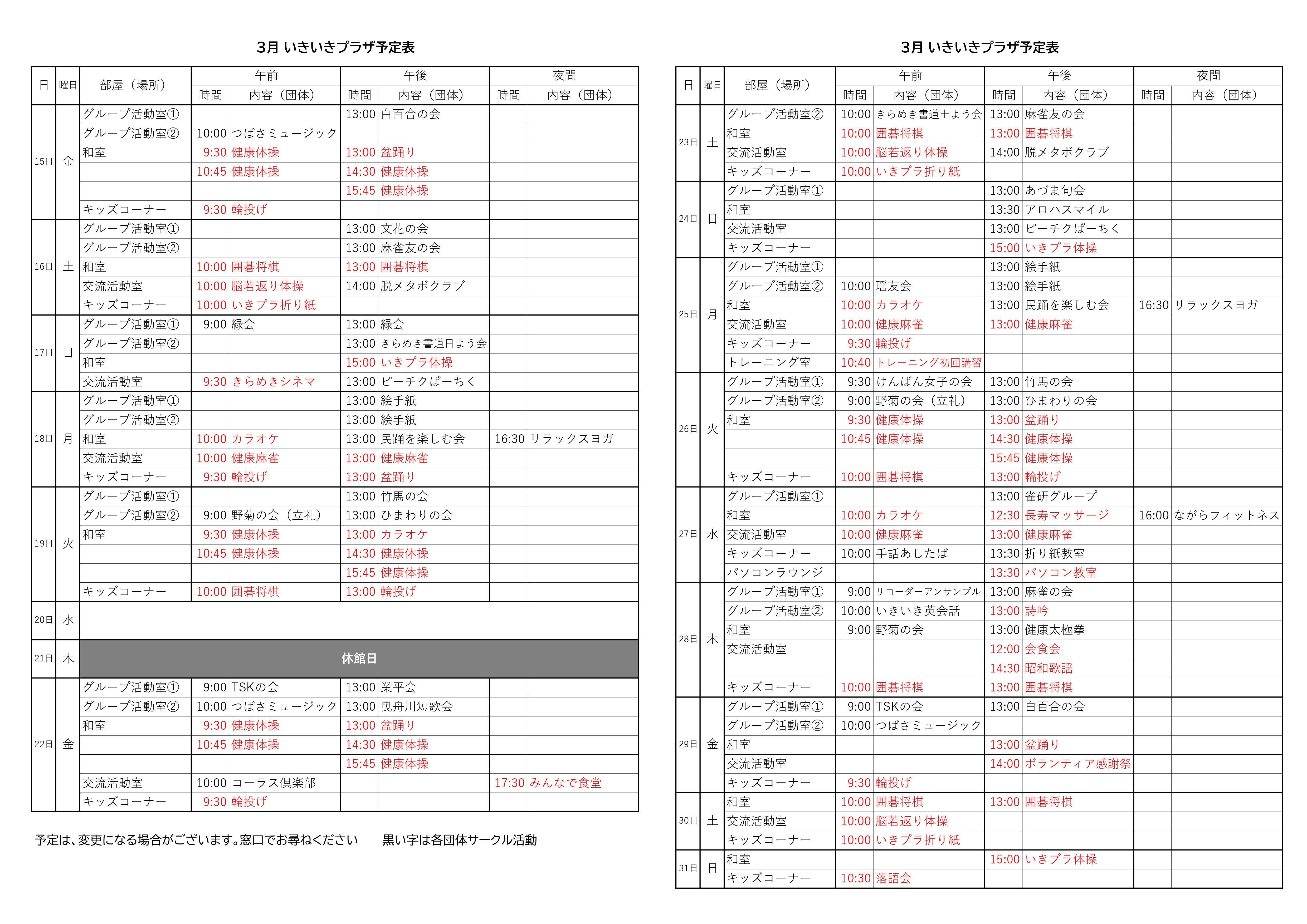 2024.02.26 活動報告 3月スケジュール Tweet シェアする 3月のスケジュールをお知らせします。 毎月の休館日は第3水曜ですが、3月20日祝日のため、翌日の、21日木曜日が休館日です。 前の記事 2024.02.26 活動報告 3月の月だより 次の記事 2024.02.26 活動報告 あざやかな梅のお花(*^-^*) 一覧へ戻る