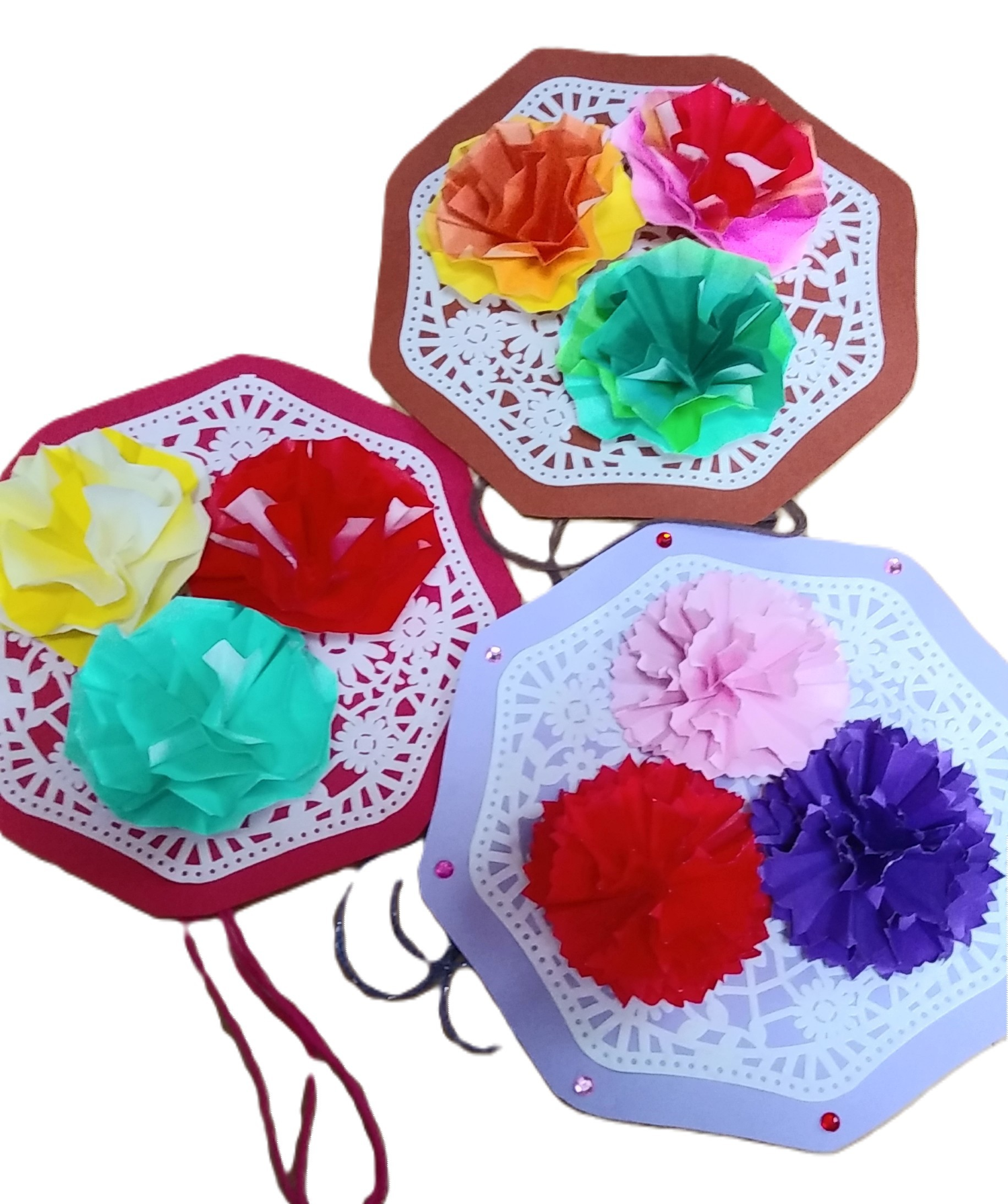 4月27日のいきプラ折り紙講座では、2種類のカーネーションの花を作成。両面同色折り紙を使用し、本物に近い形のものと、バラの花に似た、華やかなカーネーションの2種類を作ってみました。思ったより、簡単に立体的にできるので、皆さん、いくつも作っていらっしゃいました。レースペーパーを色画用紙に貼り、壁掛けにしてみました。おしゃれなインテリアカーネーションの出来上がりです。