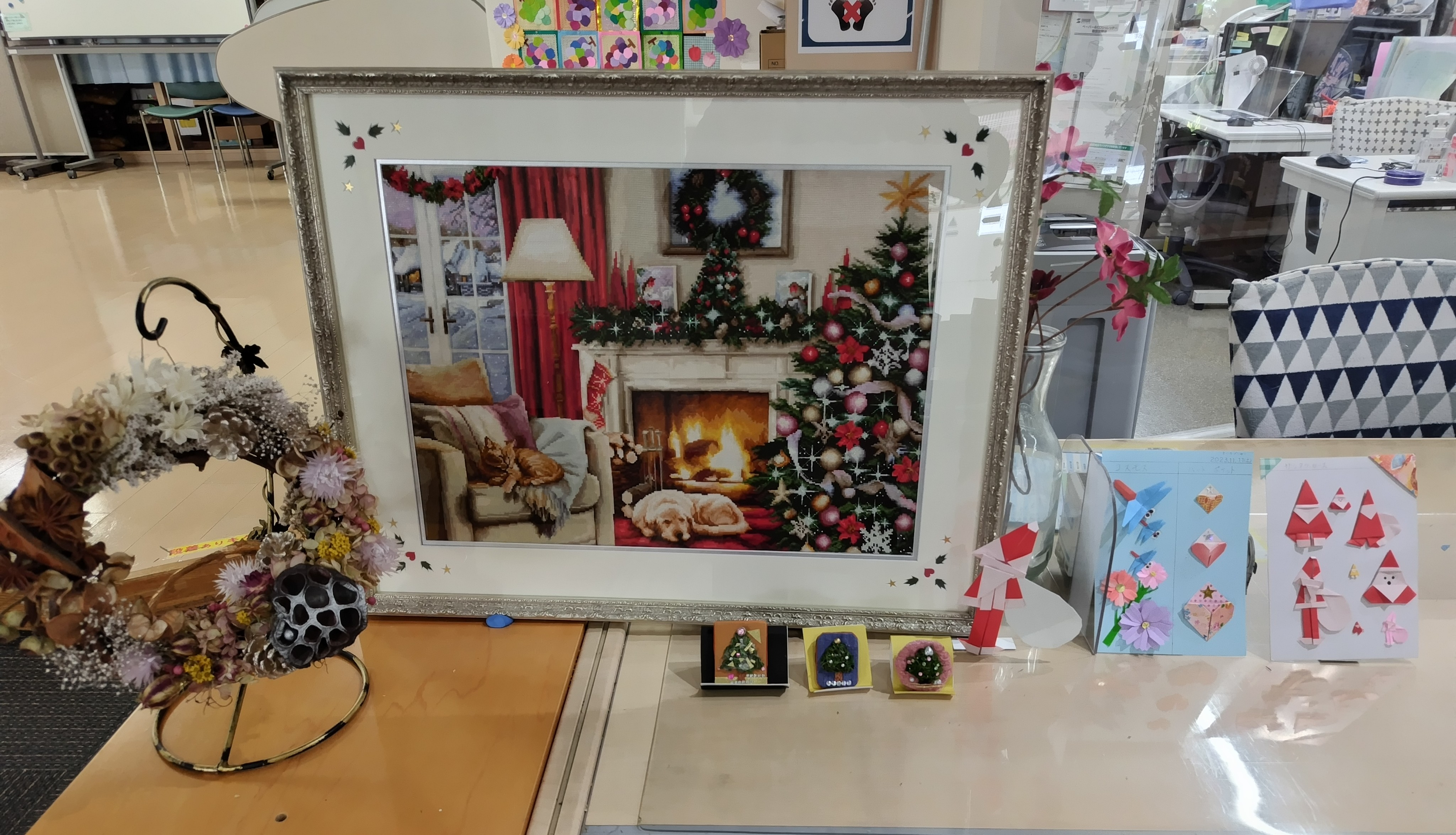 その他、いきプラ折り紙の方の作品や、クリスマスアクセサリーも一緒に並べ、事務所前はクリスマスシーズン到来。どうぞご来館の際には、ご覧下さいませ。