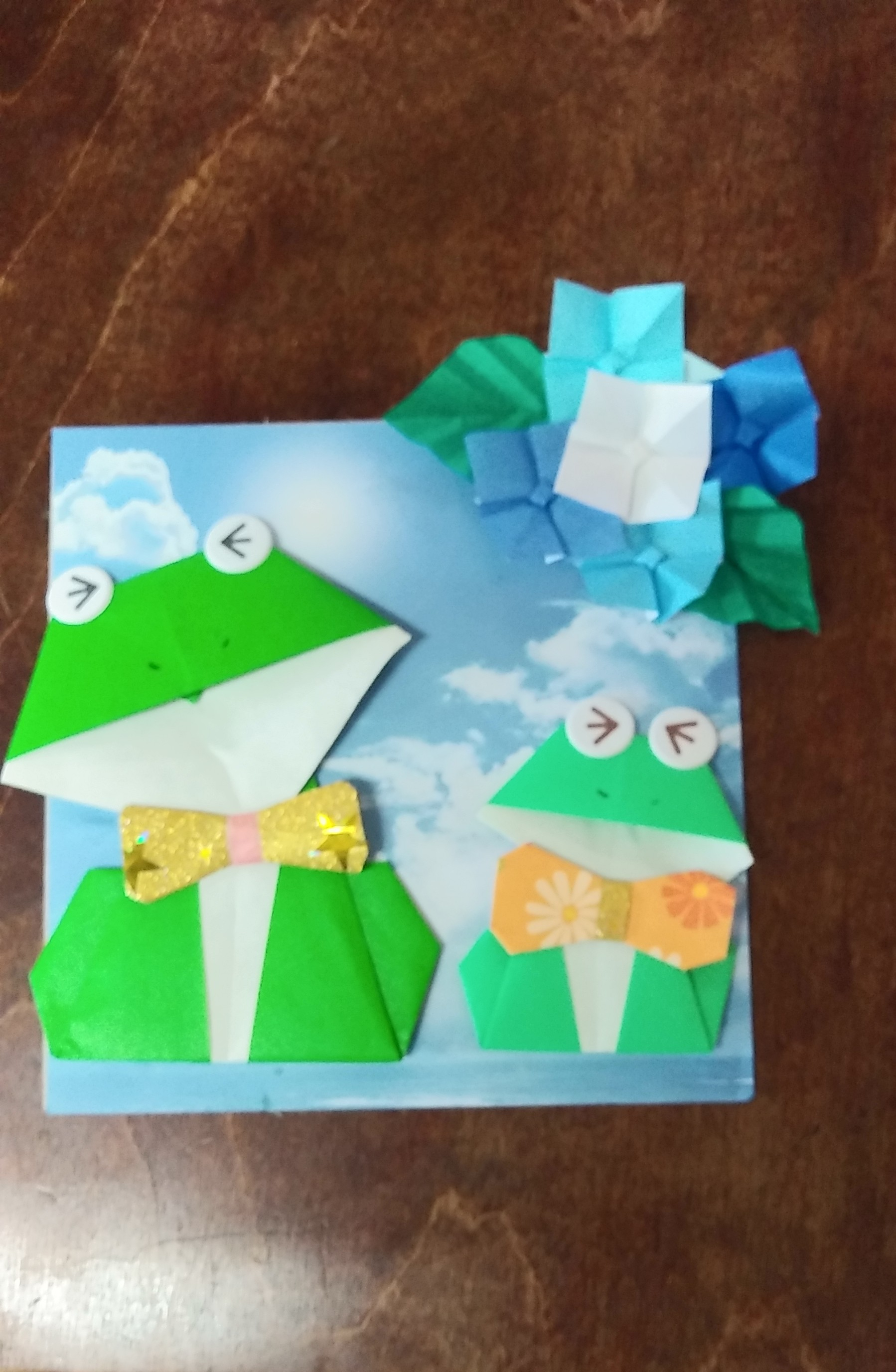 今回は、カエルや恐竜の他、子供さんたちの作りたいものを作って頂きました。ボランティアのGさんの指導のもと、空模様の台紙に、紫陽花の花、カエルの親子を貼ったパネルが人気でした。