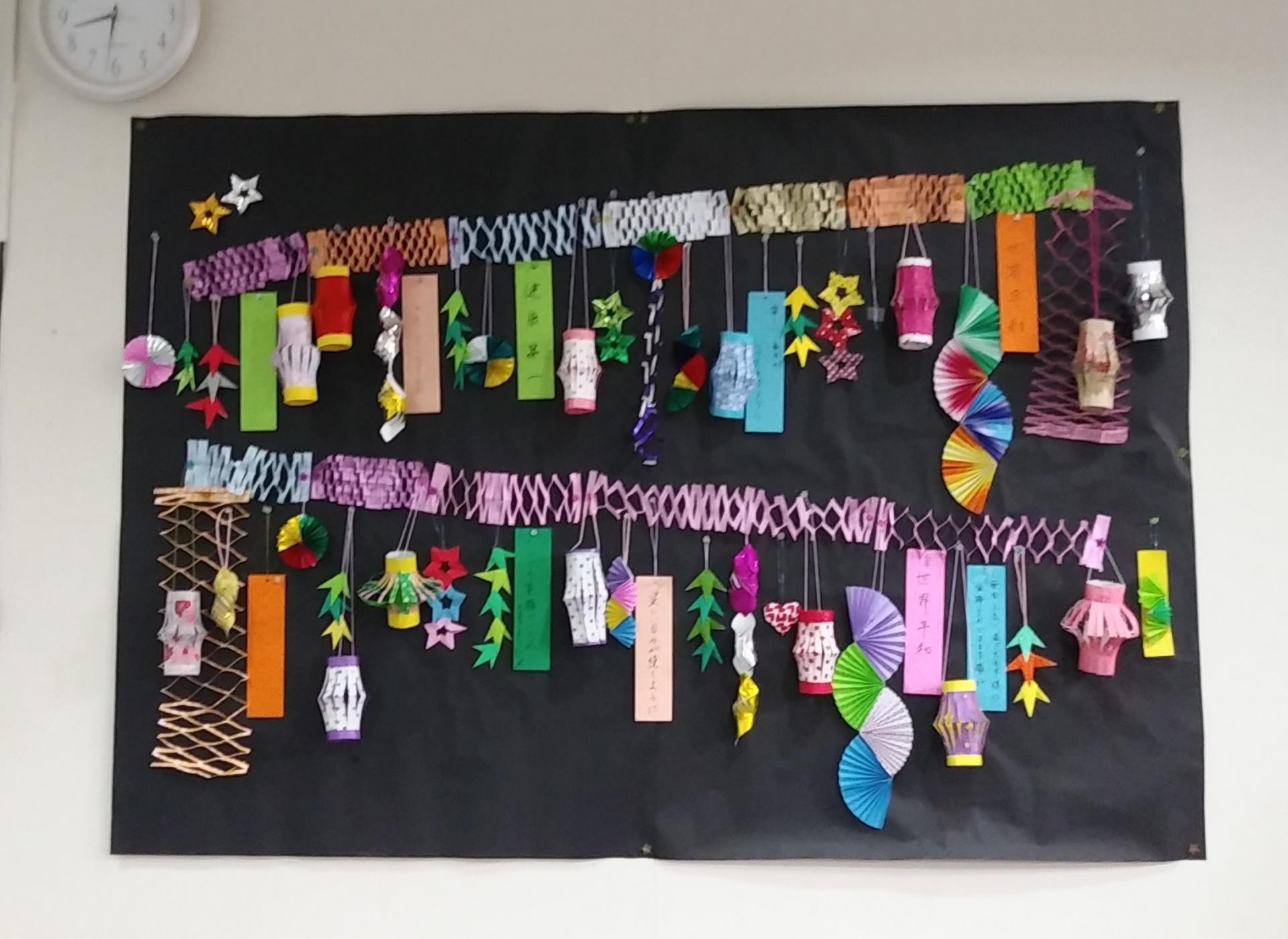 提灯が多く作られていますが、提灯には、周囲を明るく照らすことから、「魔除け」の意味があるとされているとのことです。また、短冊に願いを書いて頂いておりますが、提灯は、「神様が、読みやすくなるよう短冊の願いを明るく照らす」といった意味も込められているとのことです。ラウンジに展示しています。