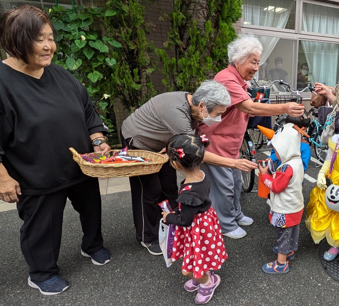 元気な「Trick or Treat!」に応えて、利用者さんがお菓子を手渡してくださいました。