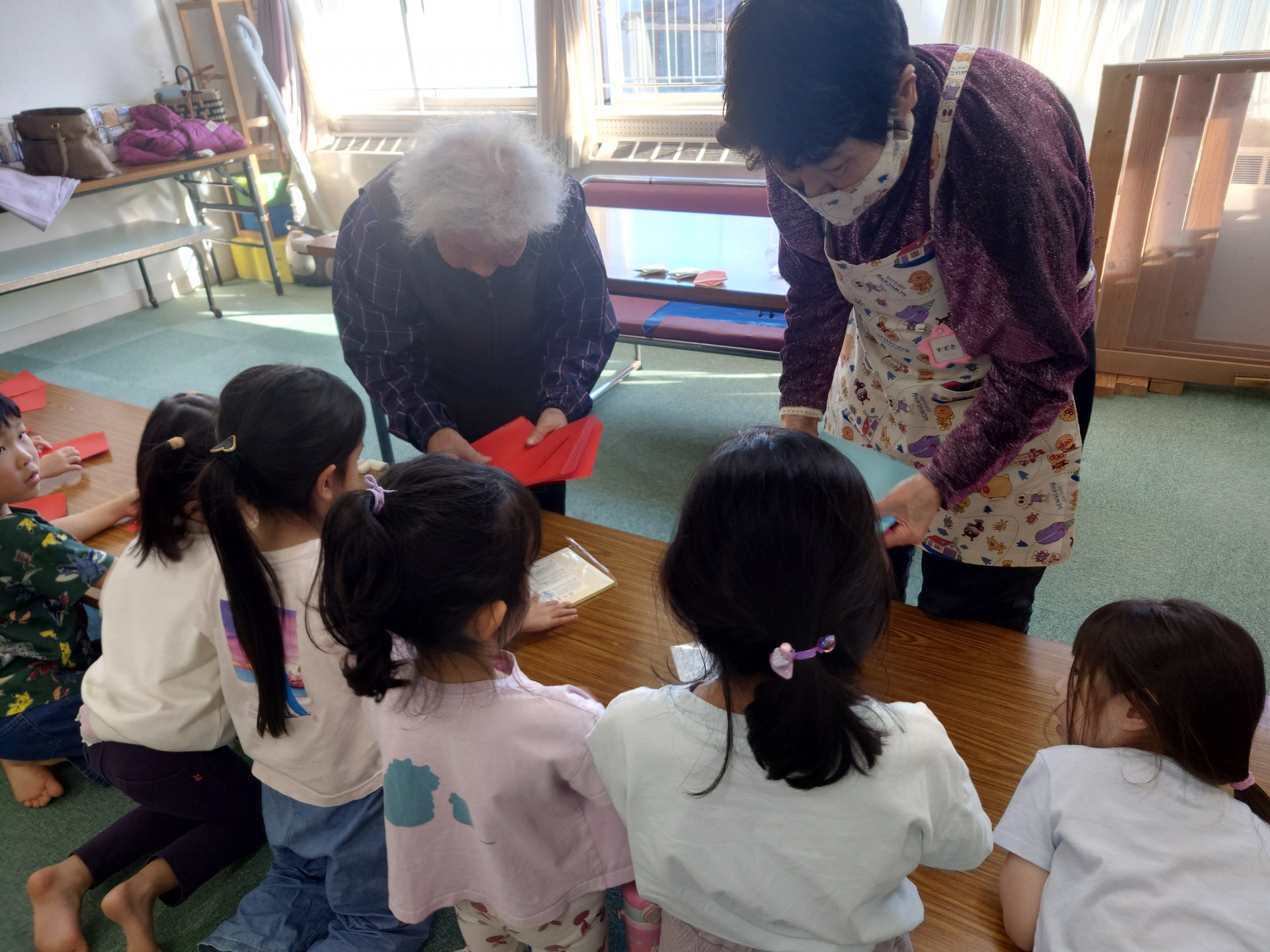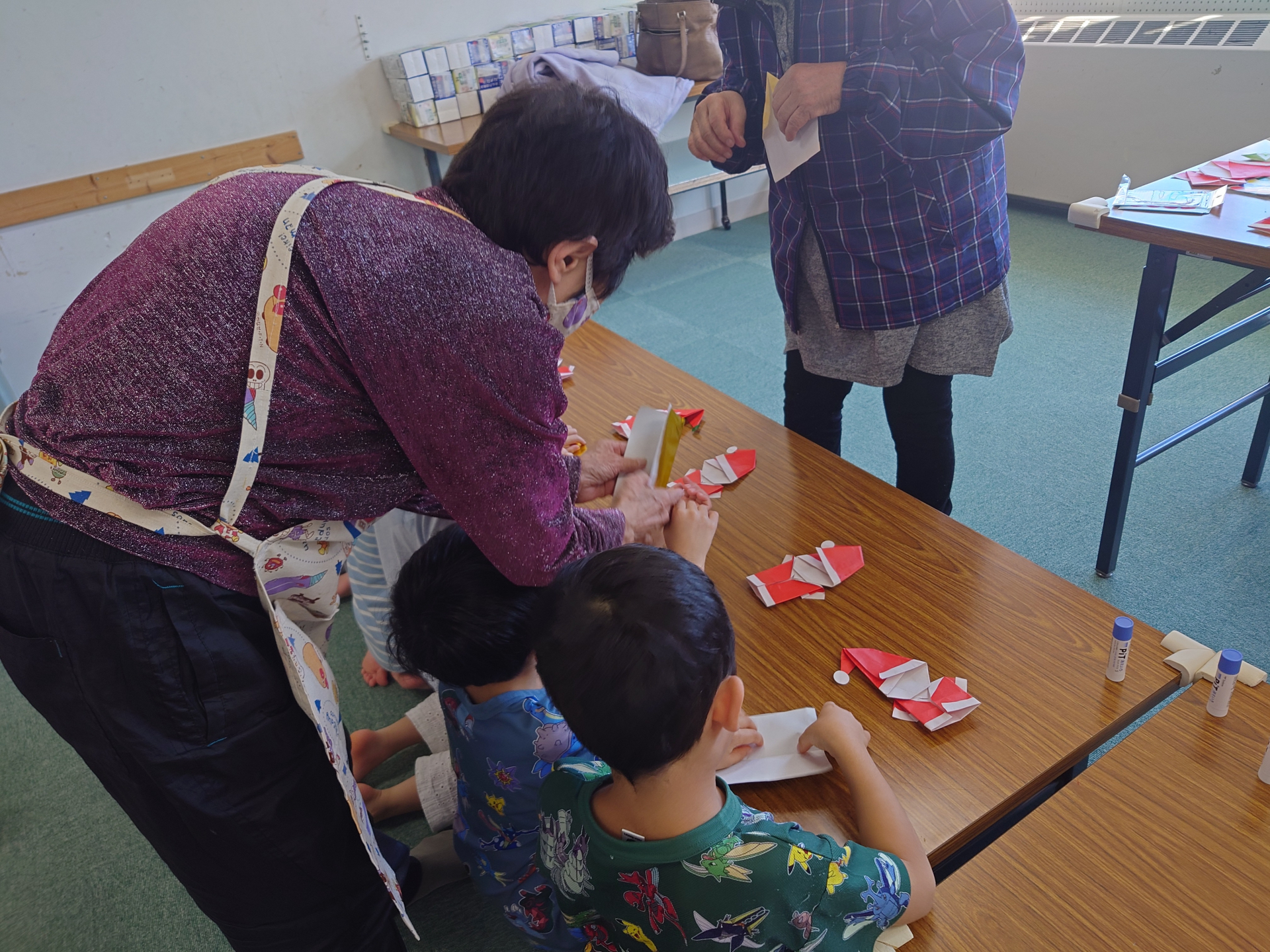 今回は折り紙を一緒にしました。クリスマスを意識してサンタクロースと鈴です。