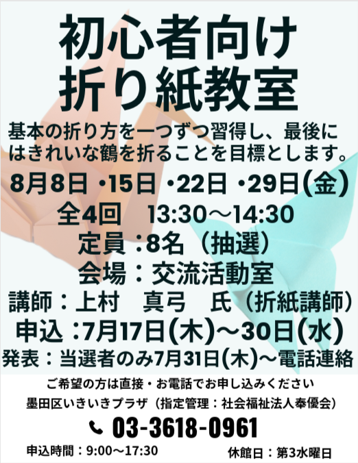 8月8日・15日・22日・29日(金)に『初心者向け折り紙教室』を開催します!!