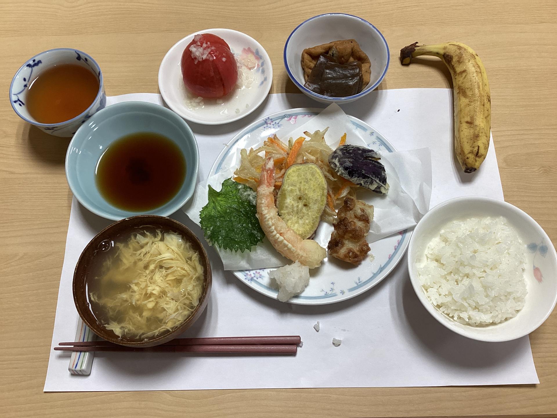 天ぷら、冷やしトマト、煮物、かきたま汁、バナナでした!!