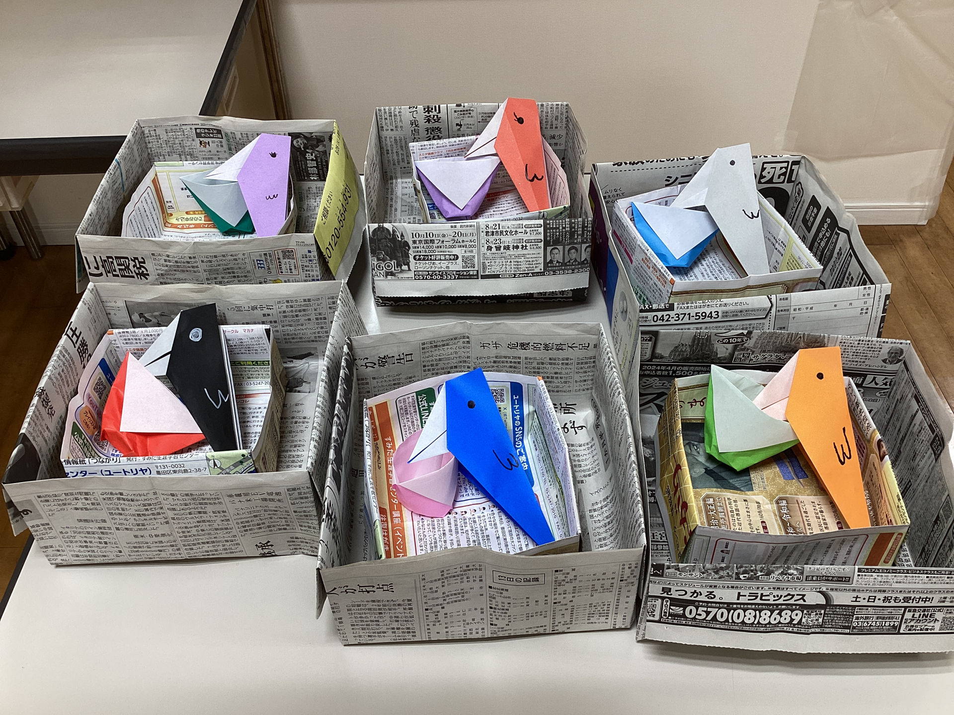 折り方を習得した後は、皆でコップやキツツキ、新聞紙や広告を使ってくずかごを作りました!!