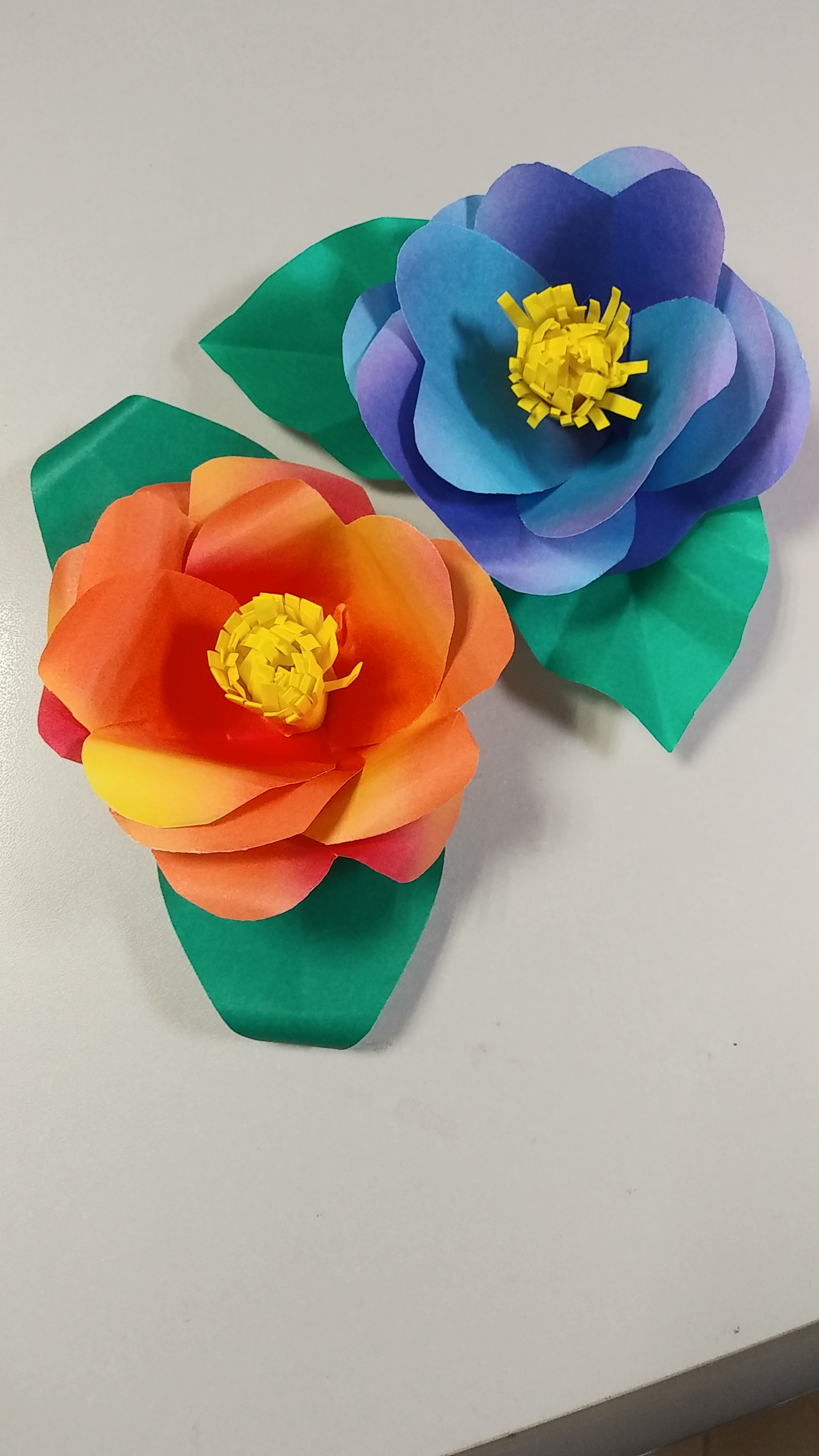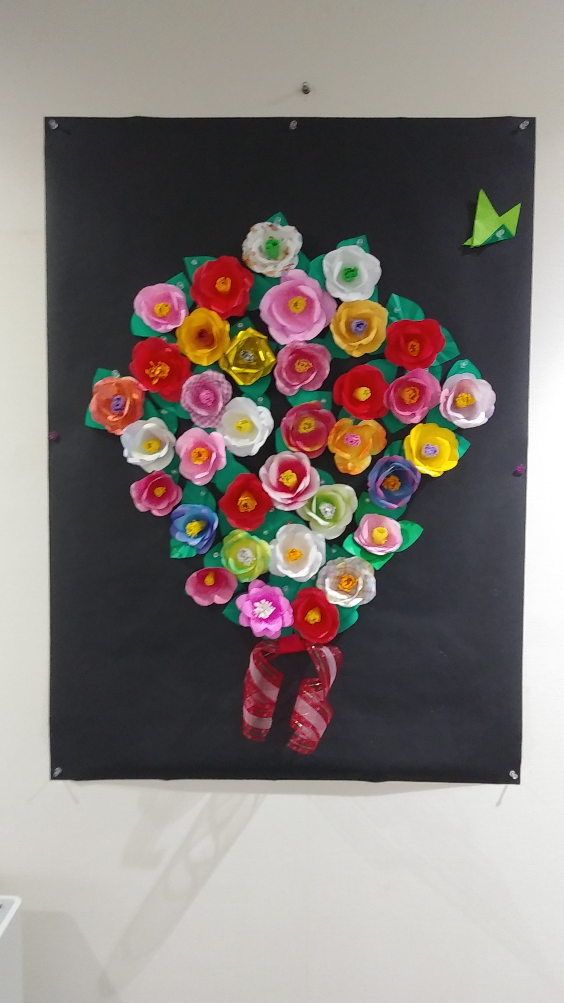 折り紙も自由に選んで頂き、色とりどりの華やかな椿の花ができました!皆さん、センスが良いですね!!