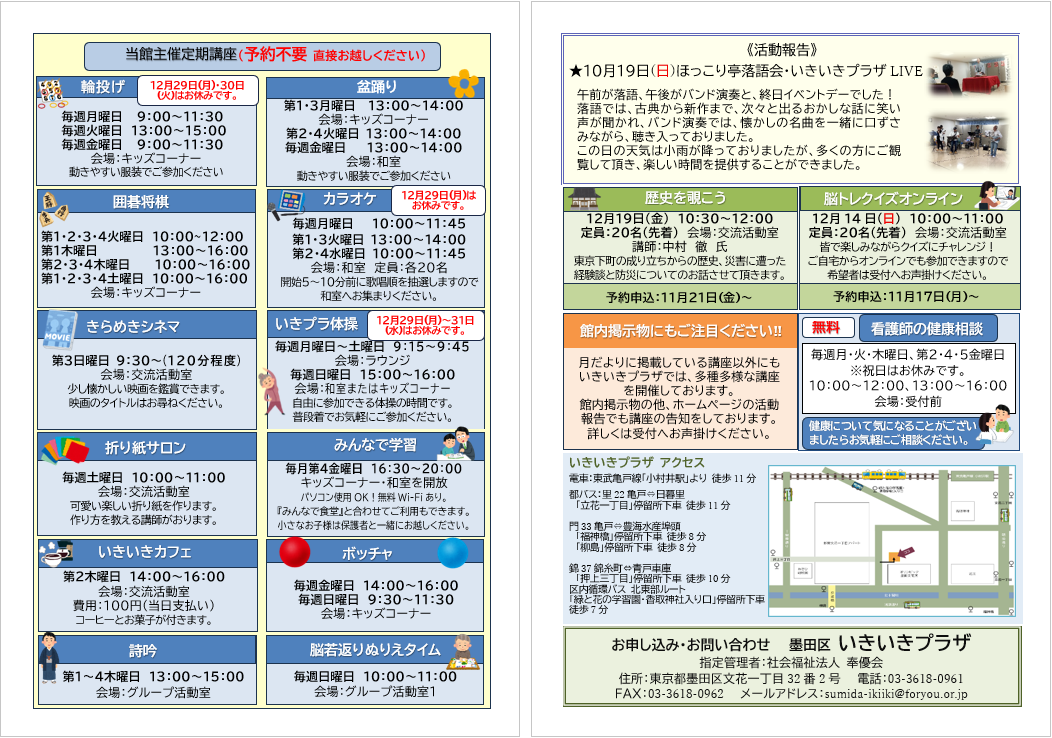 2025.11.15 お知らせ 月だより12月号を発行しました。 Tweet シェアする 月だより12月号を発行しました。 詳細は下記からご覧になれます。 月だより12月号.pdf 墨田いきいきプラザ yuriko. 前の記事 2025.11.15 お知らせ 12月の予定表を発行しました。 次の記事 2025.11.14 お知らせ 多世代交流で体操してきました‼ 一覧へ戻る