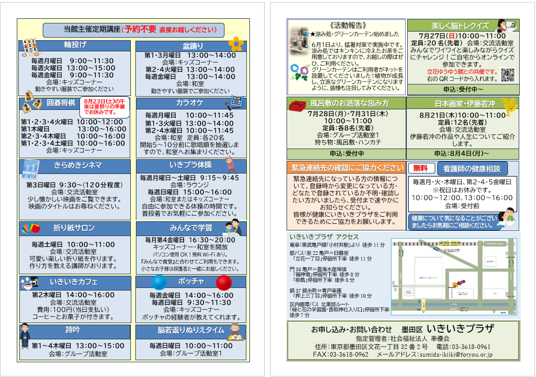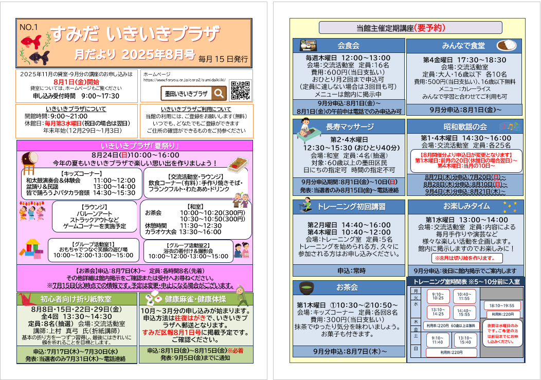 2025.07.15 お知らせ 月だより8月号を発行しました。 Tweet シェアする 月だより8月号を発行しました。 下記のリンクから詳細をご覧できます。 月だより8月号.pdf 墨田いきいきプラザ yuriko. 一覧へ戻る