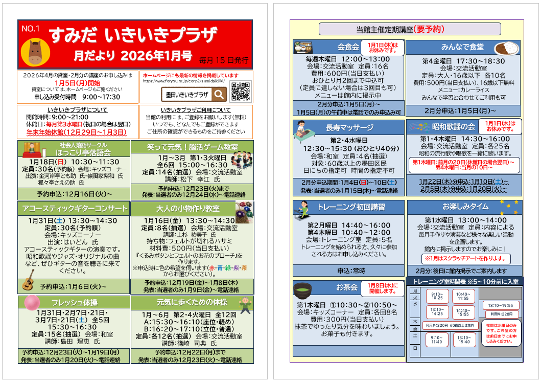 2025.12.15 お知らせ 月だより1月号を発行しました。 Tweet シェアする 月だより1月号を発行しました。 月だより1月号を発行しました。 下記のリンクから詳細をご覧できます。 月だより1月号 墨田いきいきプラザ yuriko. 一覧へ戻る