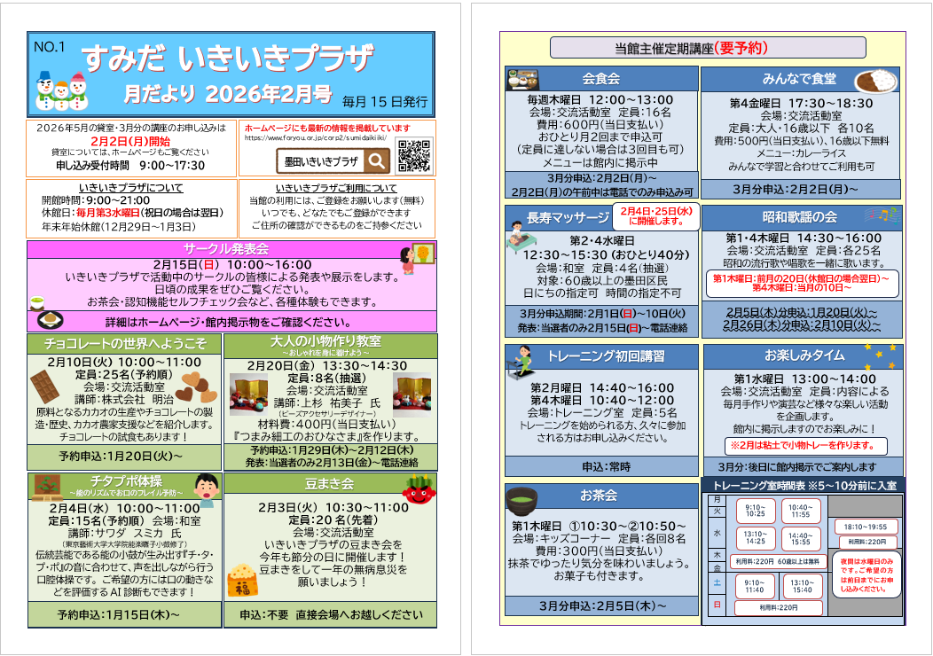 2026.01.15 お知らせ 月だより2月号を発行しました。 Tweet シェアする 月だより2月号を発行しました。 詳細は下記のリンクからご覧できます。 月だより2月号 墨田いきいきプラザ yuriko. 一覧へ戻る