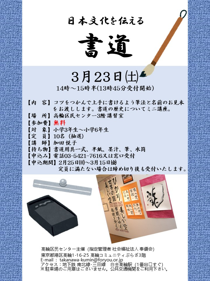 3月23日㈯ 2時~3時半 日本文化を伝える「書道」