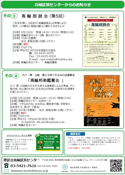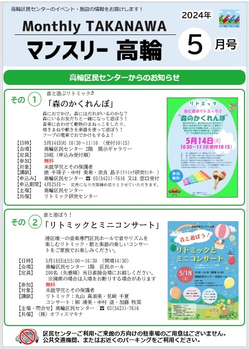 2024.04.25 ニュース 館だより《Monthly TAKANAWA》5月号 Tweet シェアする 高輪区民センターの広報誌 「Monthry TAKANAWA 5月号」 発行いたしました ダウンロードは此方から 前の記事 2024.04.25 ニュース 『熱中症警戒アラート』を理由とする区有施設利用者のキャンセル対応について 次の記事 2024.04.25 ニュース 4月25日~4月30日 港区予約システム抽選予約期間 一覧へ戻る