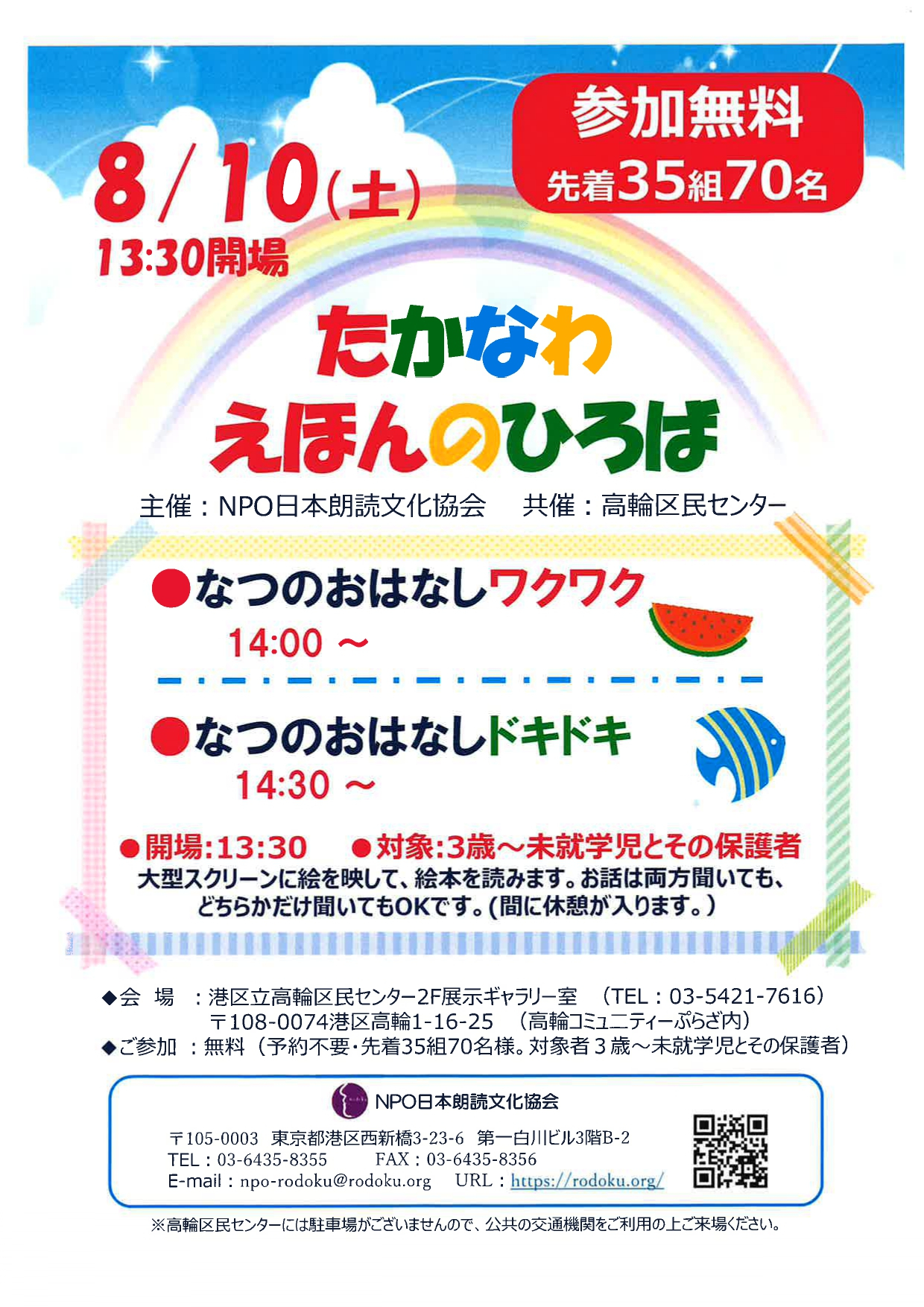 8月10日(土)14:00~ たかなわえほんのひろば(読み聞かせ)を開催いたします。