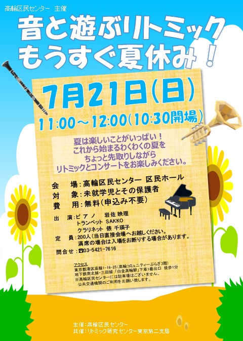 7月21日㈰ 11:00~ 音と遊ぶリトミック「もうすぐ夏休み!」開催されます♬