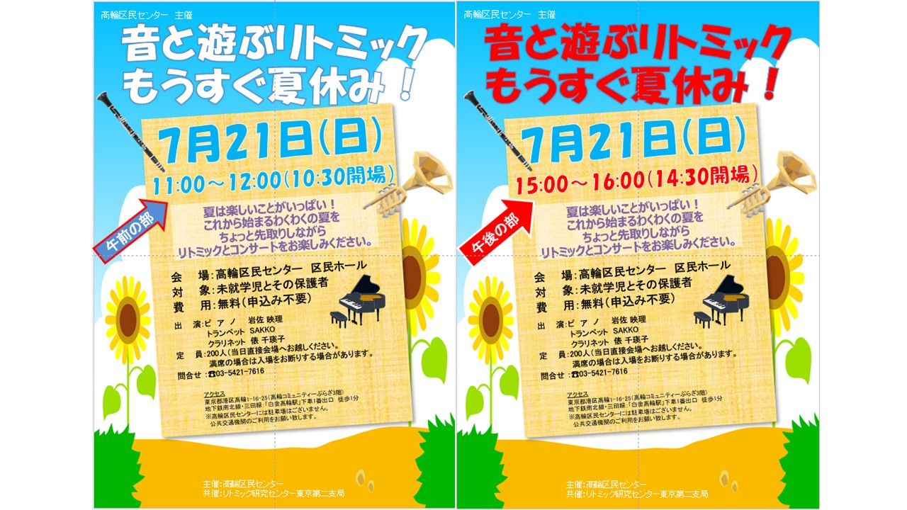 7月21日㈰ 午前の部11時~・午後の部15時~ 音と遊ぶリトミック「もうすぐ夏休み!」開催されます♬