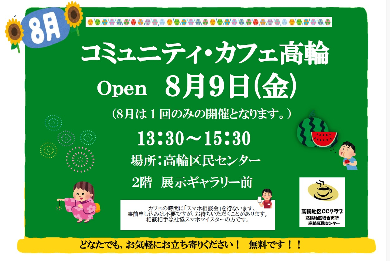 8月9日㈮ 「コミュニティ・カフェ高輪」開催のお知らせです。 「コミュニティ・カフェ」高輪は高輪地区CCククラブが中心となり、運営しているカフェです。 8月は1回のみの開催になります。