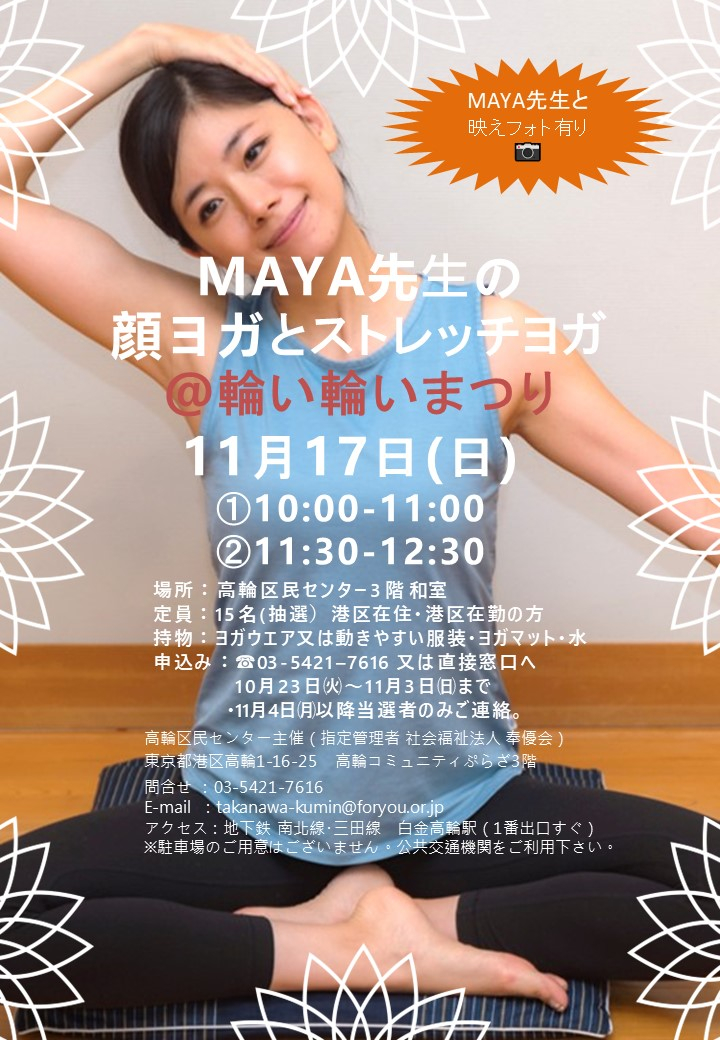 輪い輪いまつりイベント② 11月17日㈰【MAYA先生の顔ヨガとストレッチヨガ @輪い輪いまつり】開催いたします!