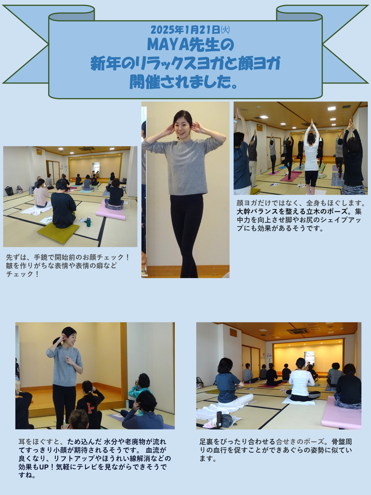 2025.01.25 活動報告 MAYA先生 新年のリラックスヨガと顔ヨガ 開催されました! Tweet シェアする Maya先生新年のリラックスヨガと顔ヨガ (午前中の部) 開催されました! 高輪区民センター 担当:高橋 前の記事 2025.01.25 活動報告 音と遊ぶリトミック「お正月あそびとリトミック」開催されました♬ 次の記事 2025.01.25 活動報告 1月25日~1月31日 港区予約システム抽選予約期間 一覧へ戻る