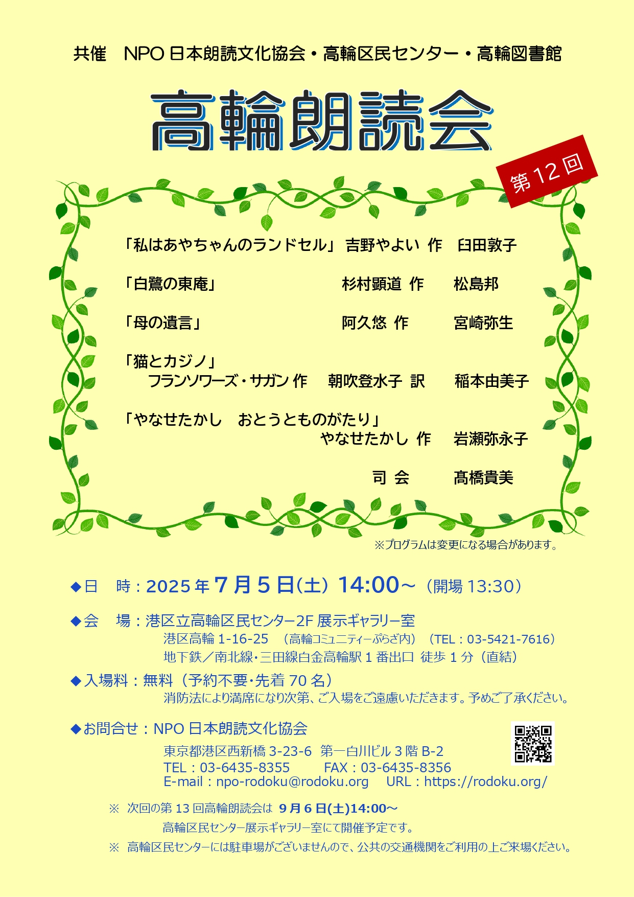 7月5日㈯ 14:00~ 第12回 高輪朗読会を開催いたします。