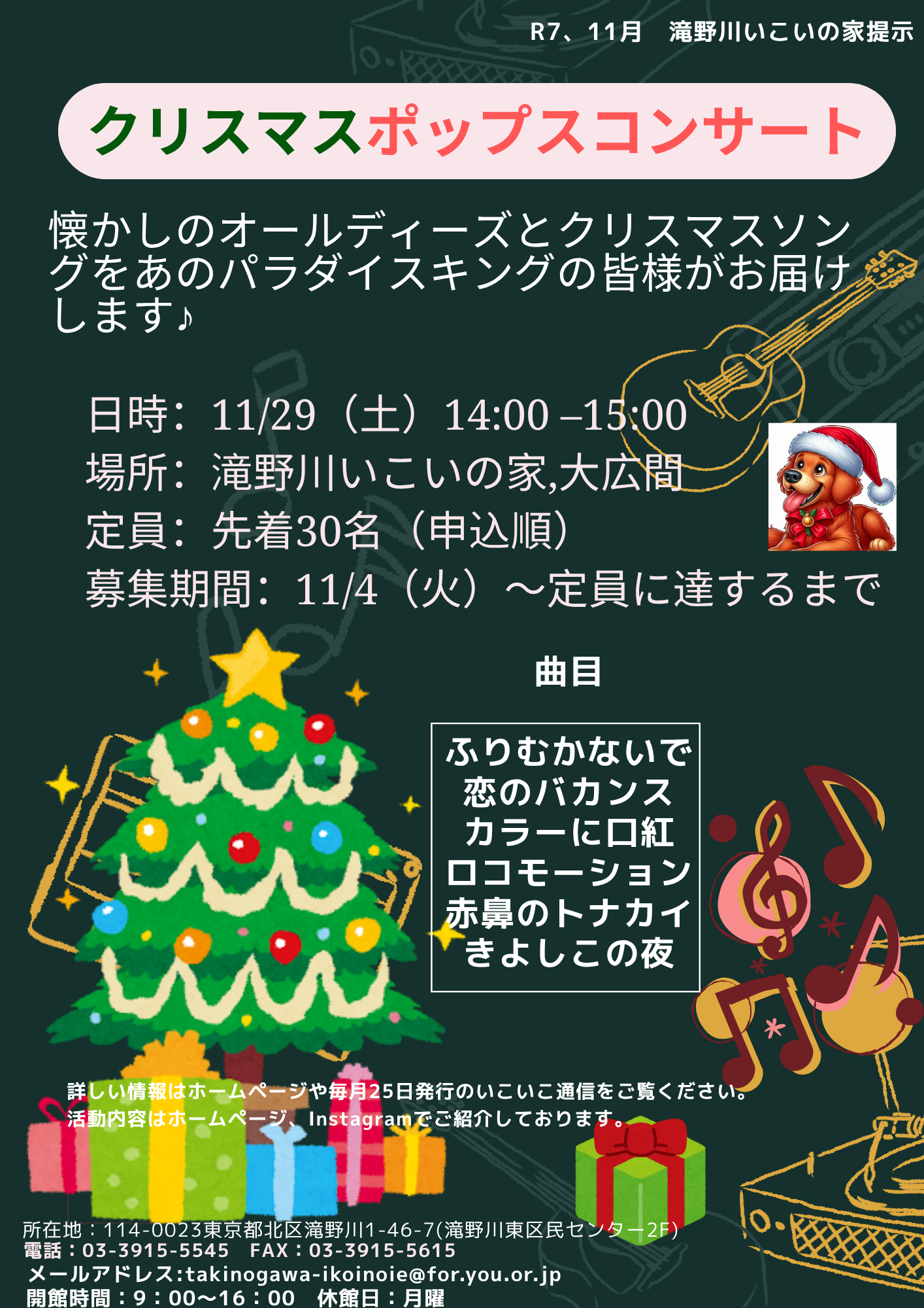 11/29(土)14時~ 滝野川老人いこいの家 2F大広間でクリスマスポップスコンサートを開催いたします!