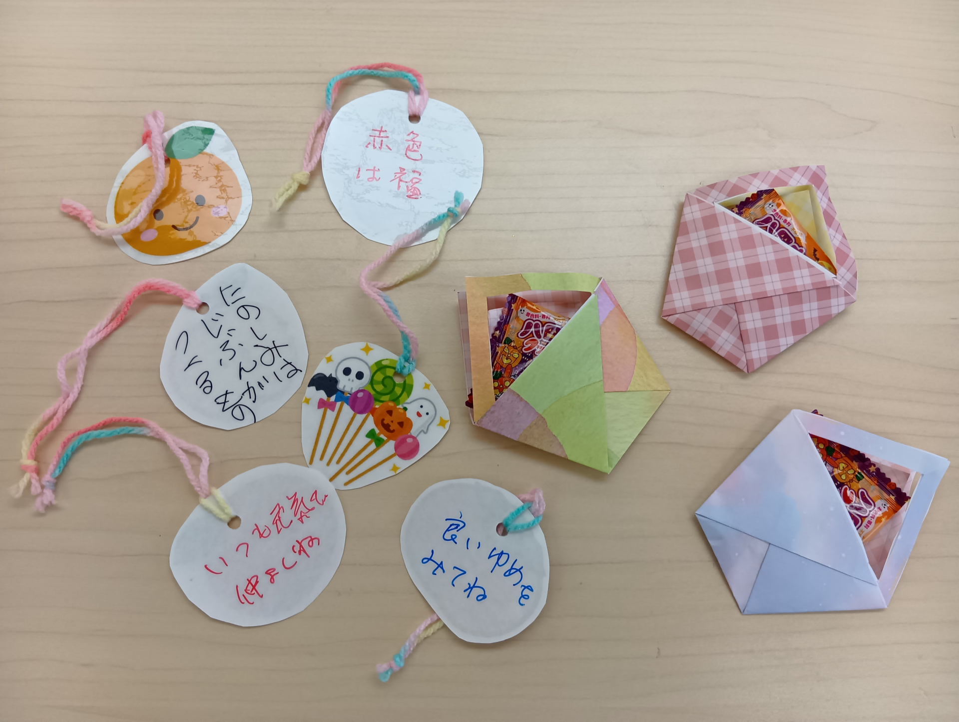 事前にボランティアさんと作成しました【メッセージカード】とお菓子の袋を、一人一人にお渡ししました🎃♪