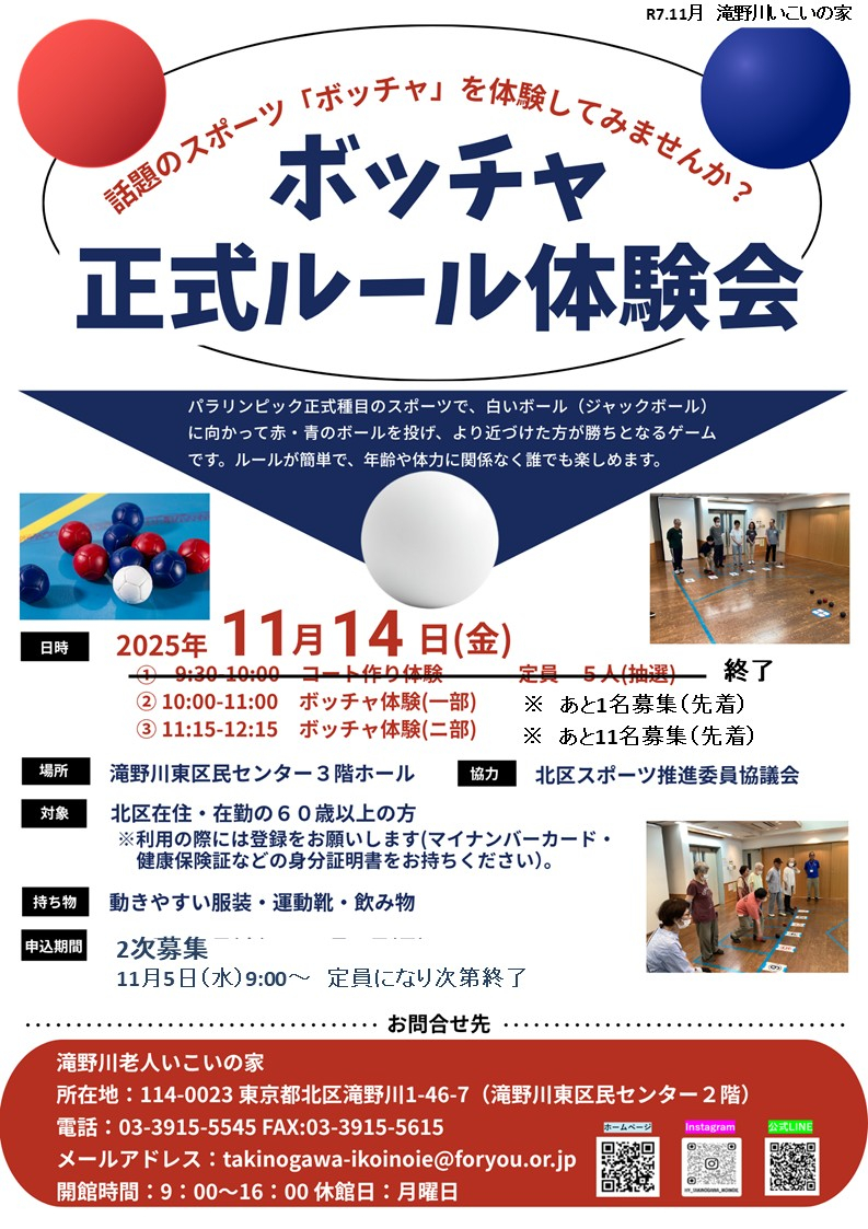 2025.11.04 お知らせ 「ボッチャ正式ルール体験会」2次募集のお知らせ Tweet シェアする 11月5日(水)9:00より ボッチャ正式ルール体験会の2次募集を行います! 先着順ですので、ぜひ体験会のご参加をお待ちしております。 前の記事 2025.11.06 お知らせ クリスマス🎄装飾作り&飾り付けのボランティアを募集します! 次の記事 2025.11.04 お知らせ 【当選発表】ボッチャ正式ルール体験会 一覧へ戻る