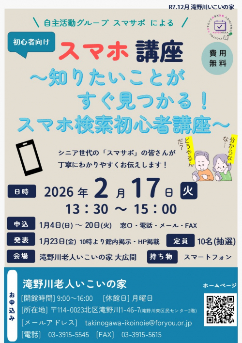 2025.12.25 お知らせ 【当選発表】絵手紙教室(1月~3月) Tweet シェアする 滝野川老人いこいの家 前の記事 2025.12.25 お知らせ 🎅クリスマスコンサートが開催されました🎄 次の記事 2025.12.25 お知らせ 【北区ニュース1月1日号掲載】初心者向けスマホ講座~知りたいことがすぐ見つかる!スマホ検索初心者講座~ 一覧へ戻る
