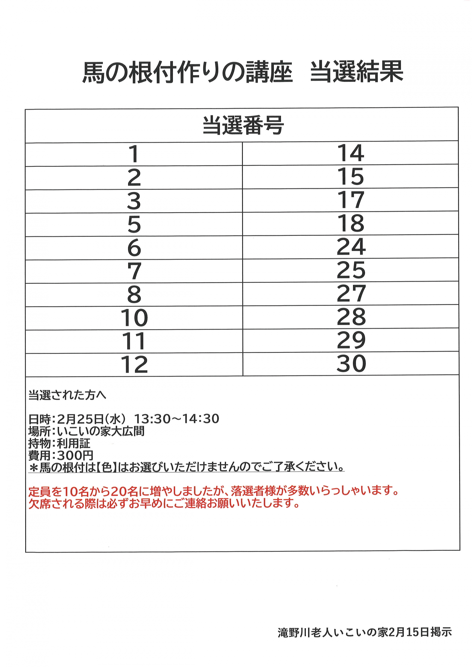 2026.02.15 お知らせ 【当選発表】馬の根付作りの講座 Tweet シェアする 滝野川老人いこいの家 前の記事 2026.02.17 お知らせ ~ イラストコーナー ~をご存知ですか? 次の記事 2026.02.14 お知らせ ネイルボランティア💅 一覧へ戻る