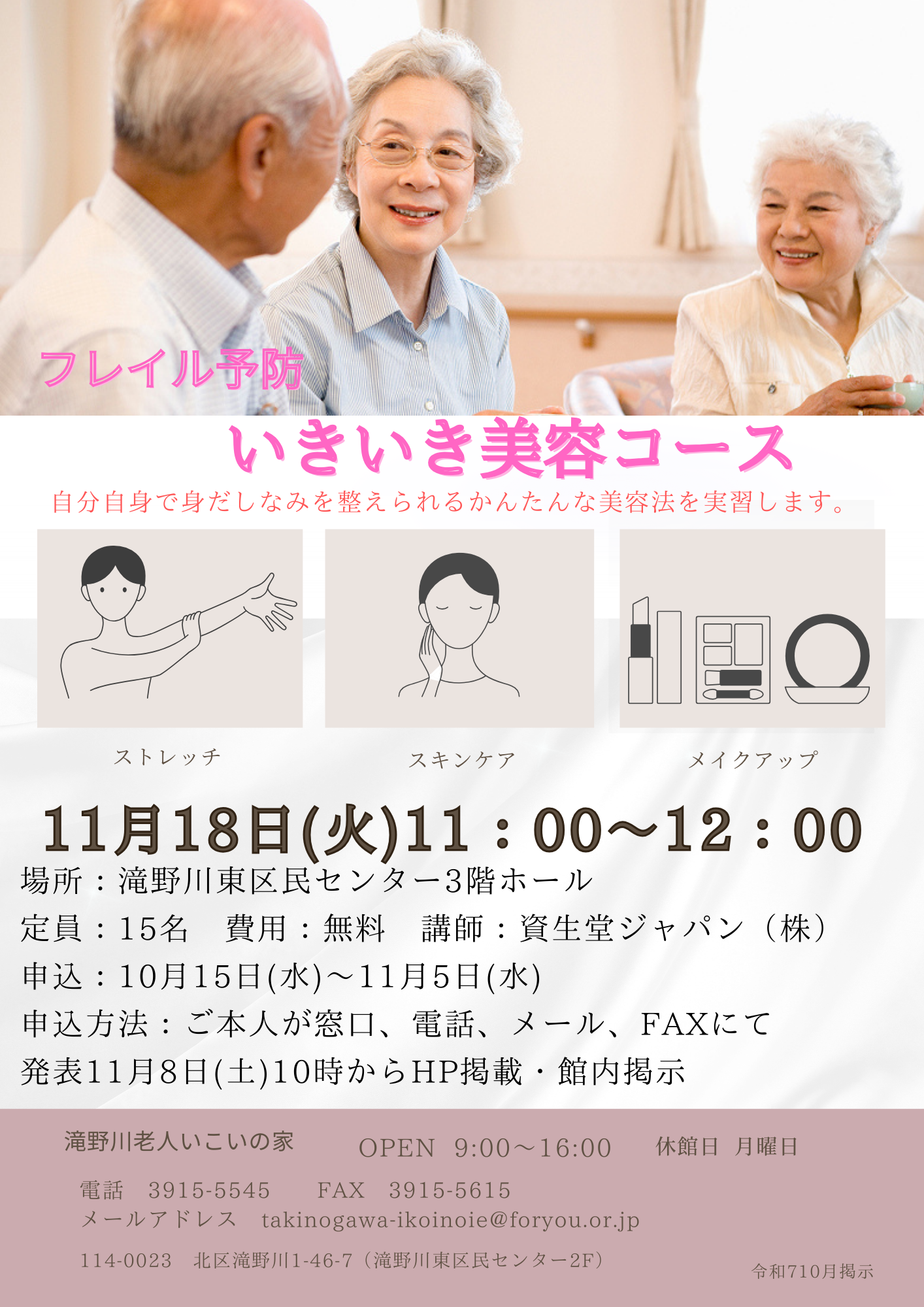 【北区ニュース10月1日号掲載】「フレイル予防 化粧療法いきいきセミナー」開催のお知らせ