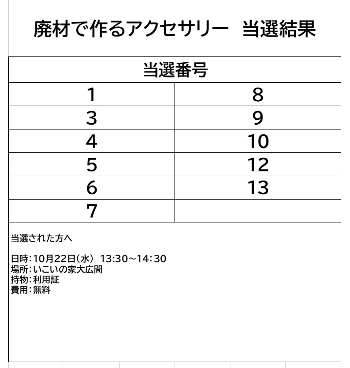 【当選発表】廃材で作るアクセサリー(10月22日(水)開催)