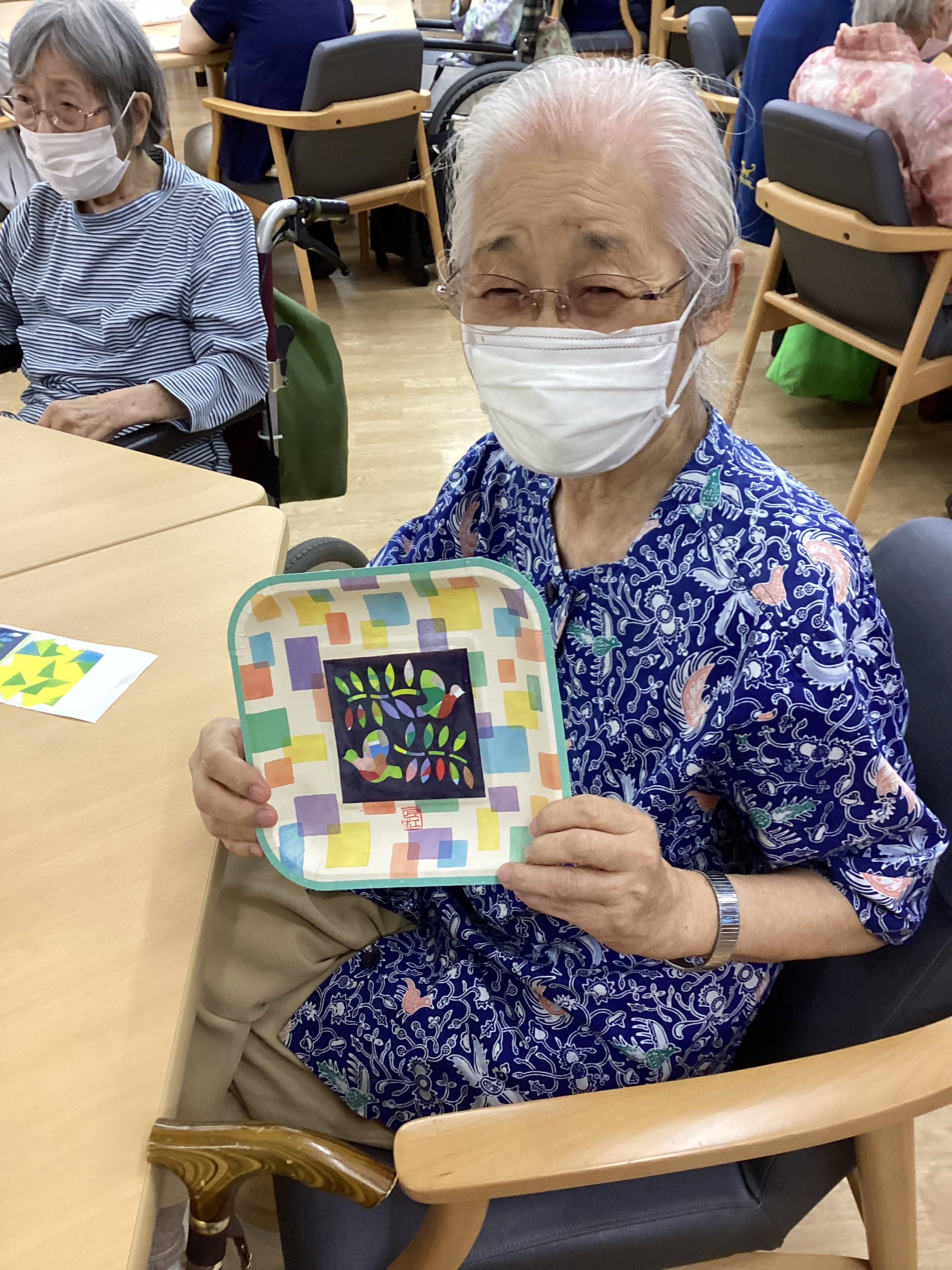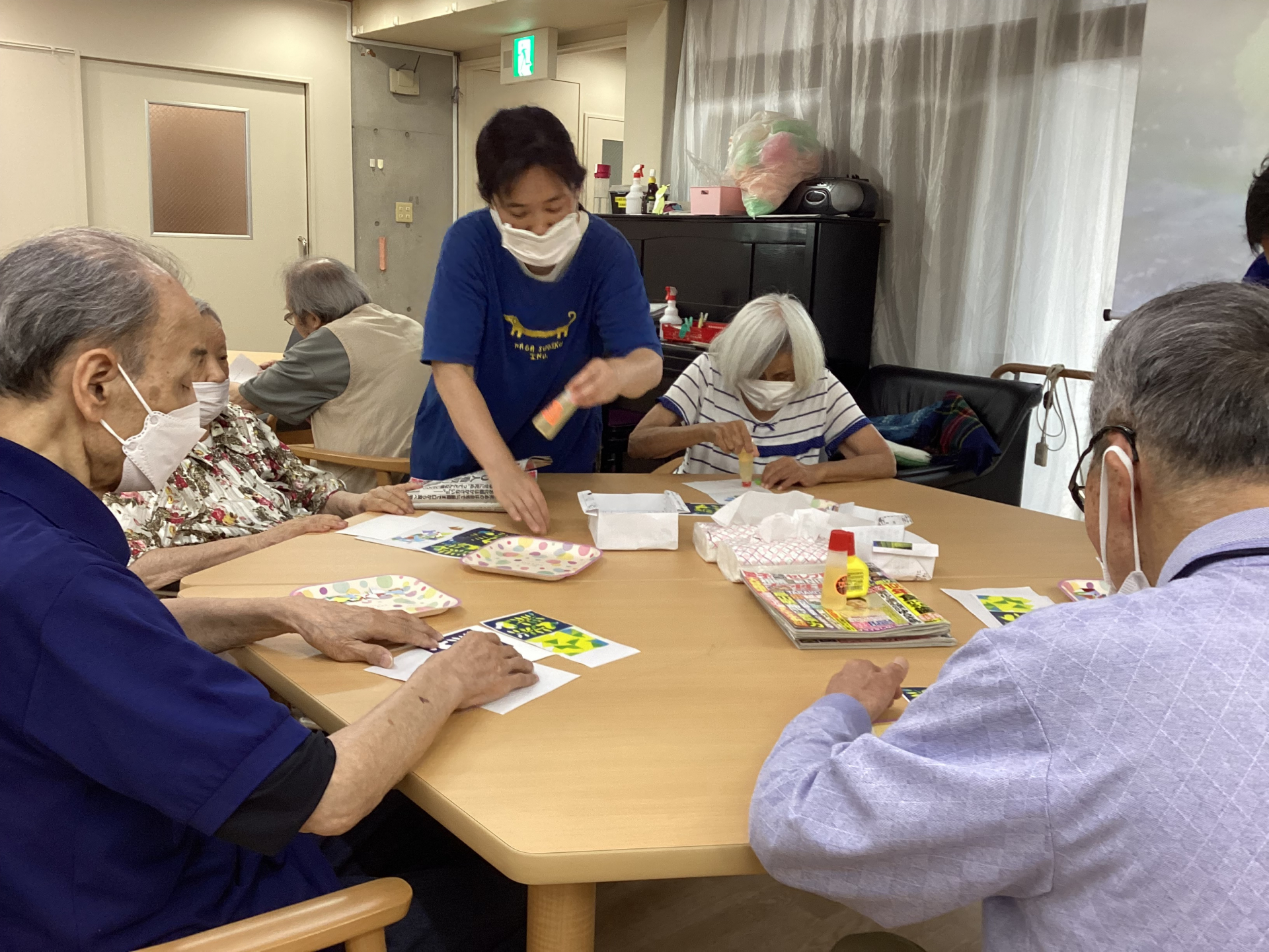 同じ物がなく、世界で1つの小窓です。利用者の皆さんは、真剣な顔で折り紙を1つ1つ貼って