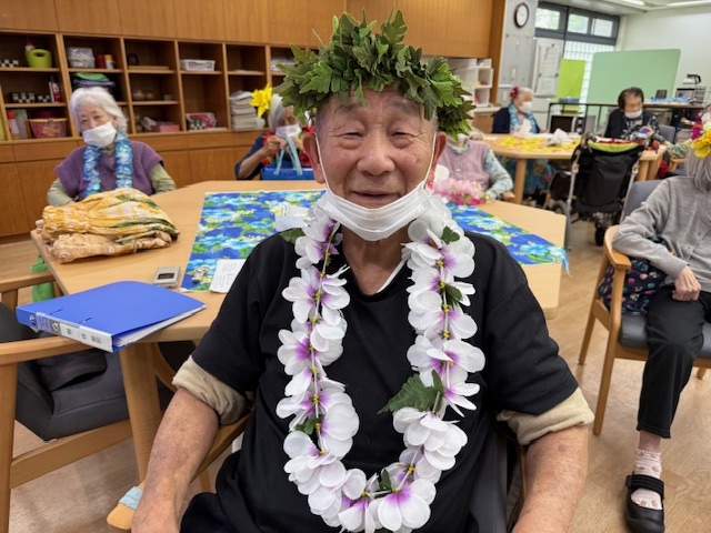 装いハイビスカスのレイを首に下げ「月の夜は~浜に出て~」と歌い