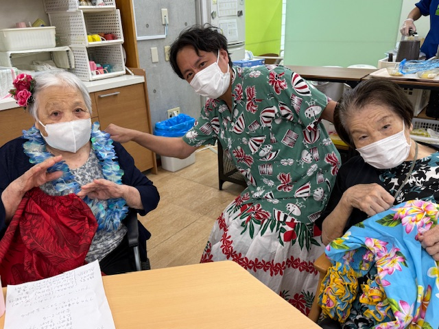 ハワイアンソングに合わせて、ハイビスカス柄のスカートにワンピースを