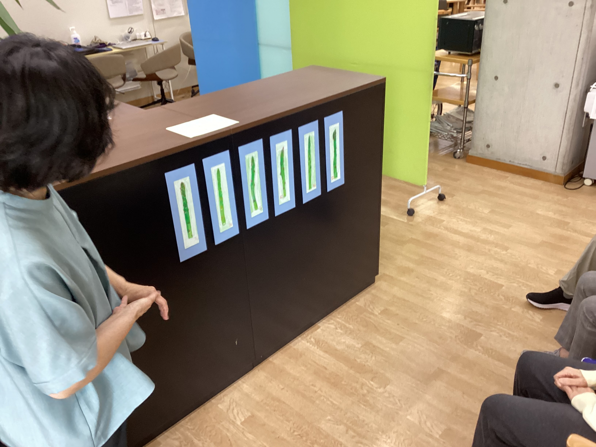 まずは「臨床美術」でした。今回は「グリーンアスパラのネガポジ画」のテーマとして
