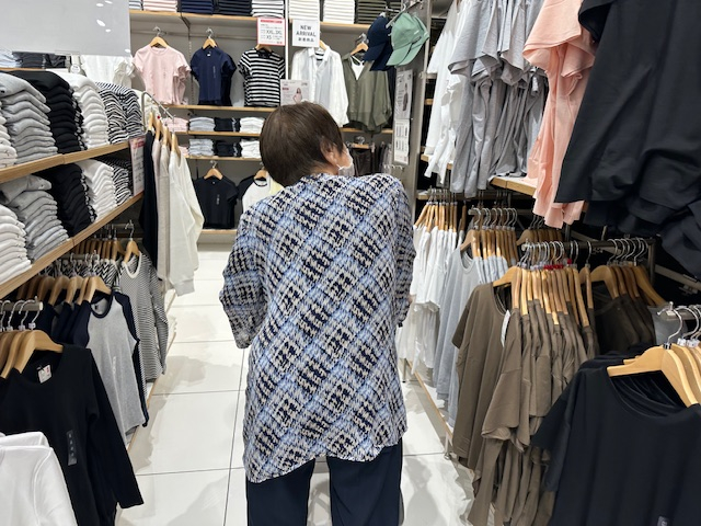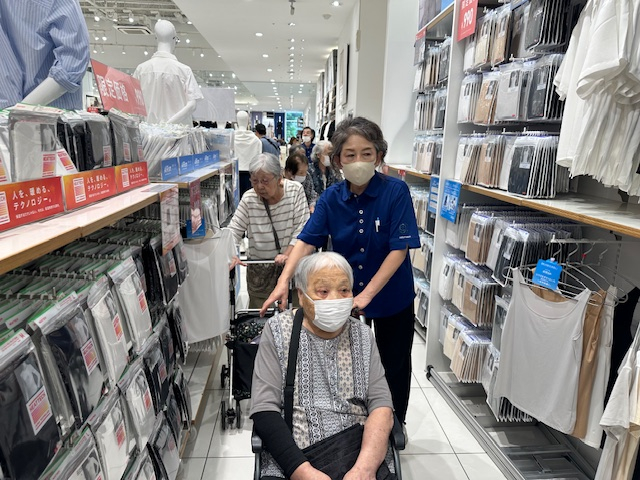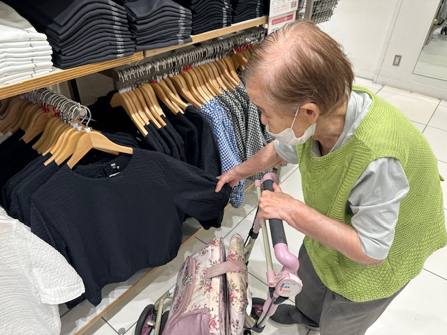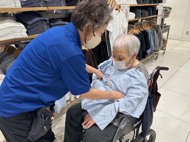 車椅子の方も職員と一緒に広い店内を安全に移動され、ご自分に合うお洋服を探されていました。