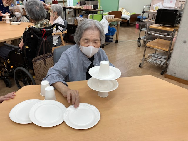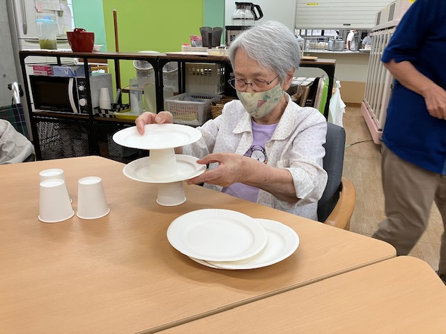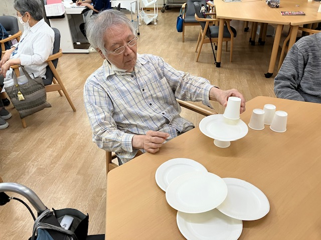 緊張しながら紙コップに、紙皿を重ねていくこのドキドキ感