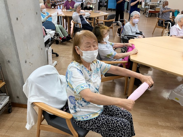 腕を伸ばしたり両手で握ったり各自職員が指導しながら動かしております。